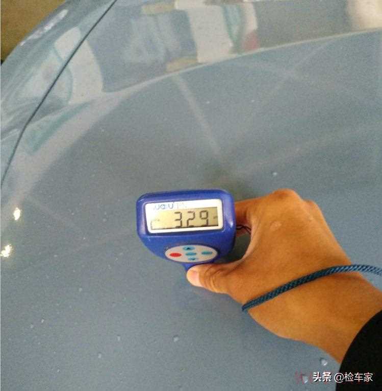 因为车身贴了车衣,不能直观的检测漆面。这种情况我们一般会在一个不容易碰撞的地方取一个数值作为参照标准。车顶、C柱或A柱都是这样的地方,测量了左右AC柱四个地方,取一个平均值来作为参考。这个车包含车衣正常的漆面厚度大概是300±30区间。所以,前机盖这个数值是没有问题的。