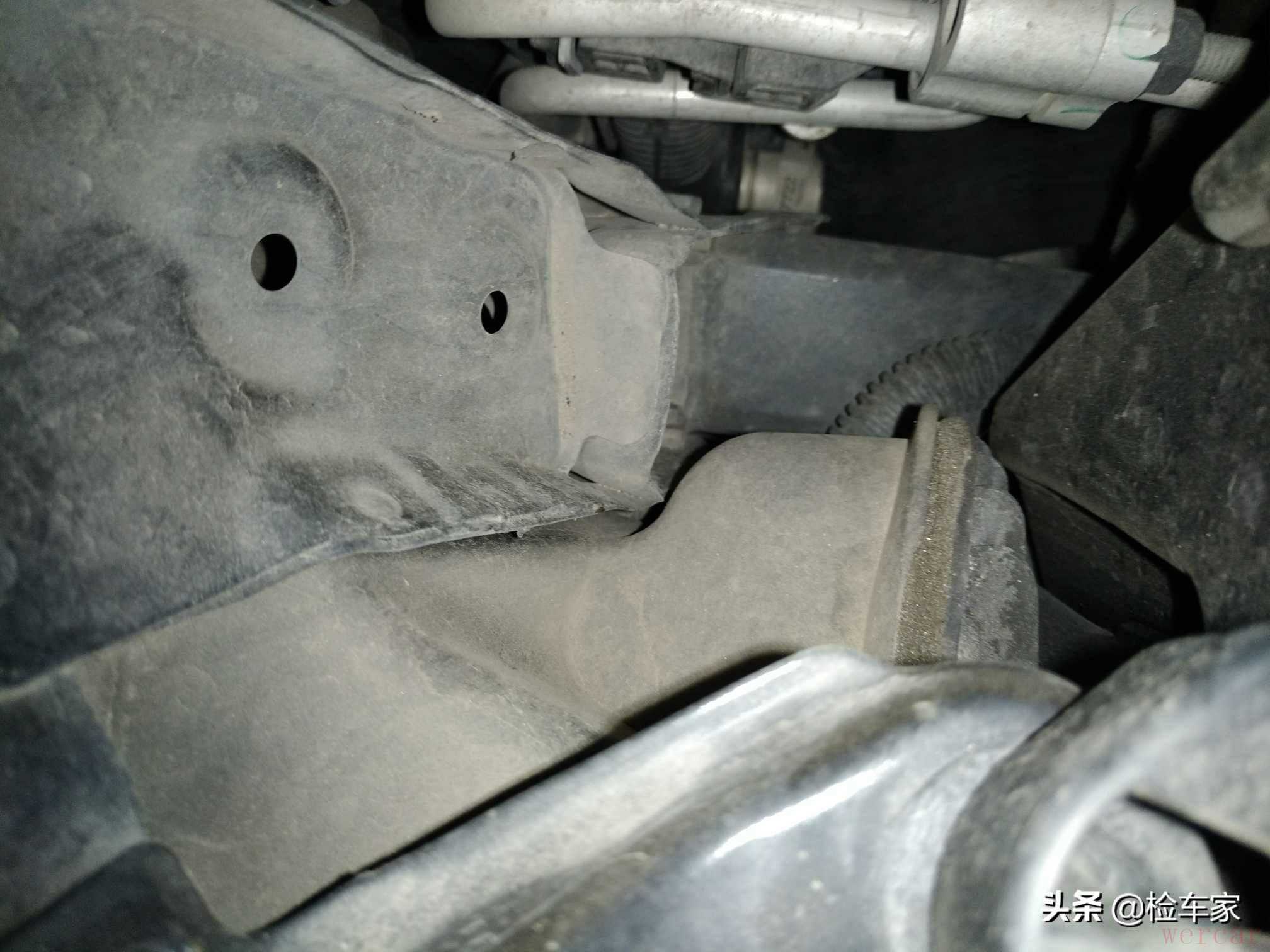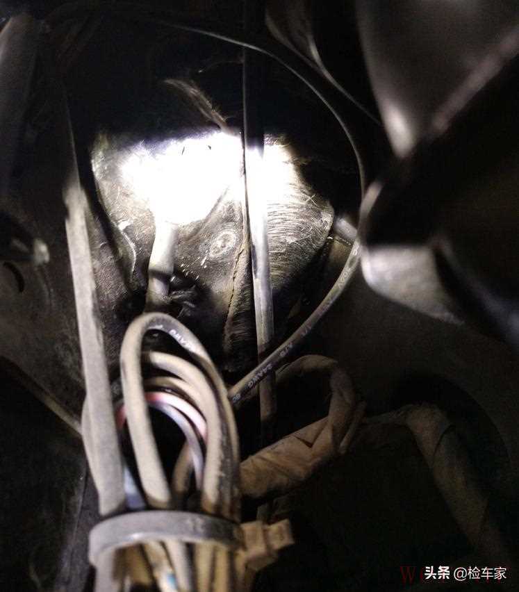 接着在翼子板梁边上发现一颗焊点,明显与原厂焊点是两码事,旁边的原厂胶越看越不对劲,细细琢磨,才发现胶是原厂的,只是后期重新打过。顺着胶条往下,发现整个减震底座跟周围的连接部件全部重新打胶修复。OMG,都撞到这里了,小半个车头全换!脑海中闪现出大事故现场的画面,得跟阿虎说一下呀。