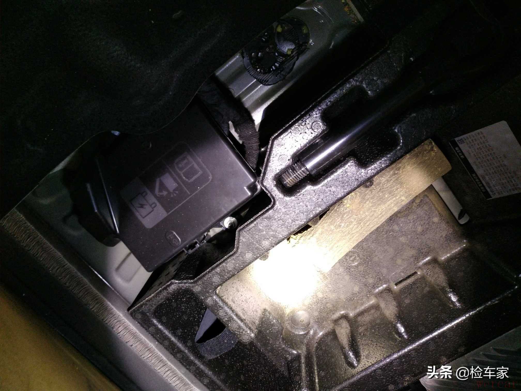 打开后备箱,后备箱盖未见拆卸,后备箱内没有异味和泥沙水渍;导水槽还是原厂焊点,后围板无变形钣金敲打切割修复痕迹;后部的追尾事故基本可以排除。