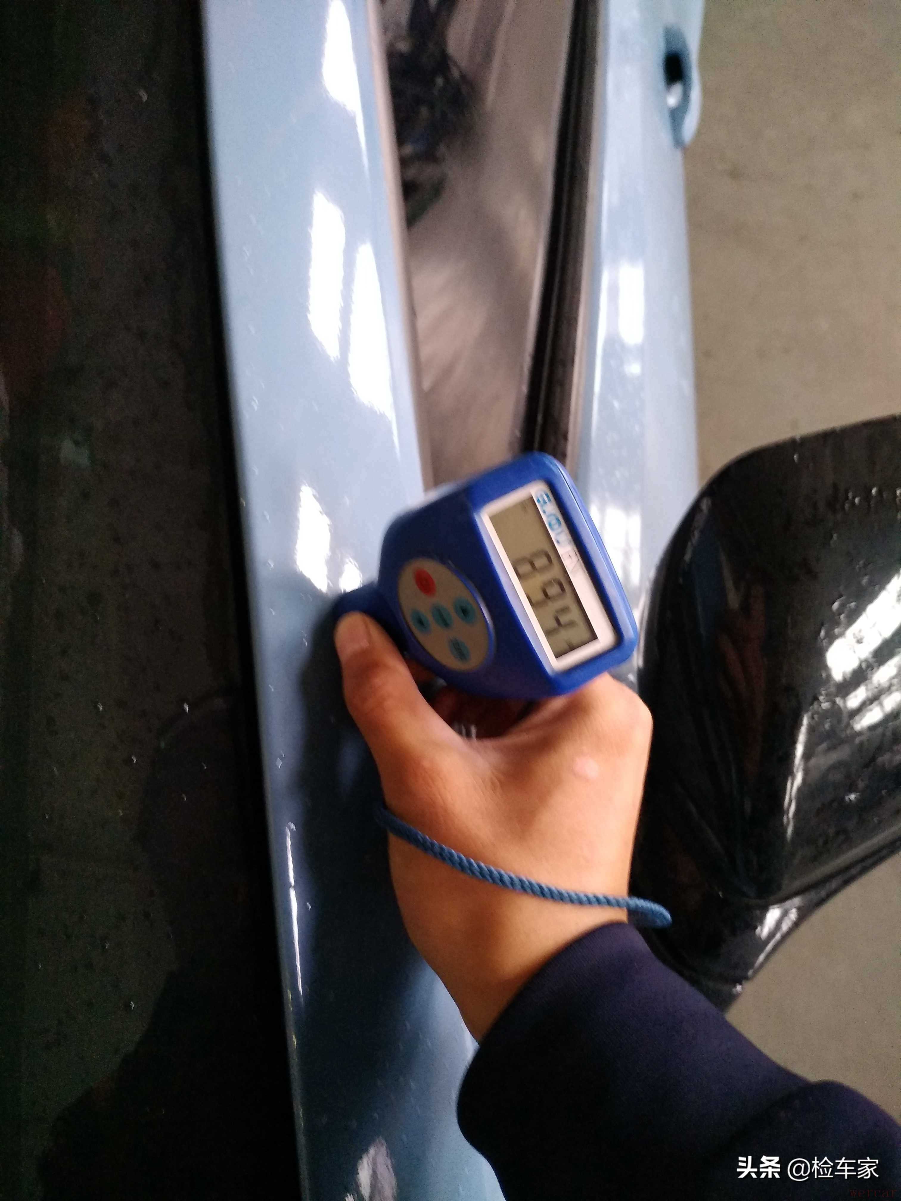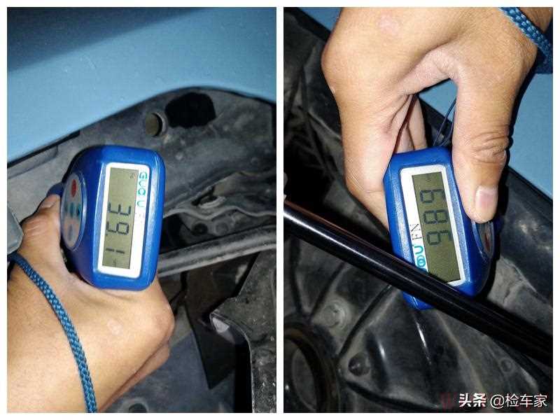 全车漆面测下来,发现一个有意思的事情。机盖300多,大顶270,右前门270,后背盖400,除开这四个地方和A柱C柱,其余覆盖件都在900左右,这就有点尴尬了。一辆车的漆面厚度是不会相差太大的,这辆车似乎有点儿不正常。