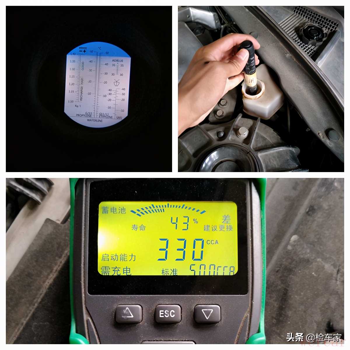 防冻液冰点测试仪显示冰点正常,无需更换;刹车油笔显示刹车油含水量也是ok的;只是电瓶寿命显示只剩下43%,而且启动能力也不足了,这就需要更换电瓶,不然半路上掉链子那可就尴尬了。