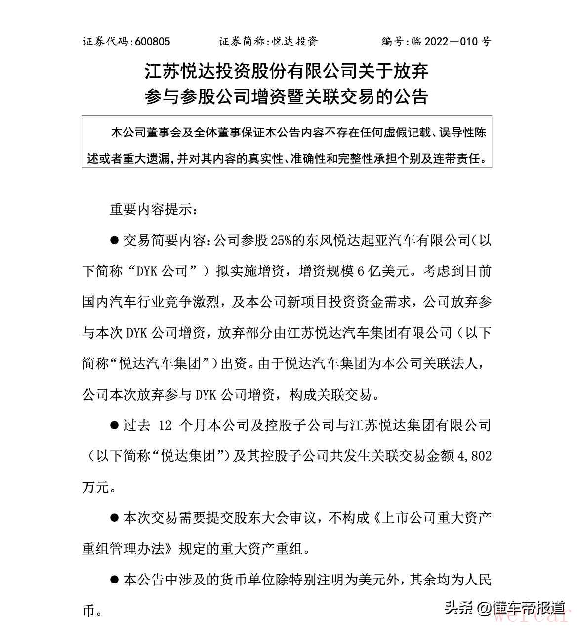 前不久,江苏悦达投资股份有限公司(简称“悦达投资”)发布公告称:考虑到目前国内汽车行业竞争激烈,及本公司新项目投资资金需求,公司放弃参与东风悦达起亚(DYK)总计6亿美元的增资。