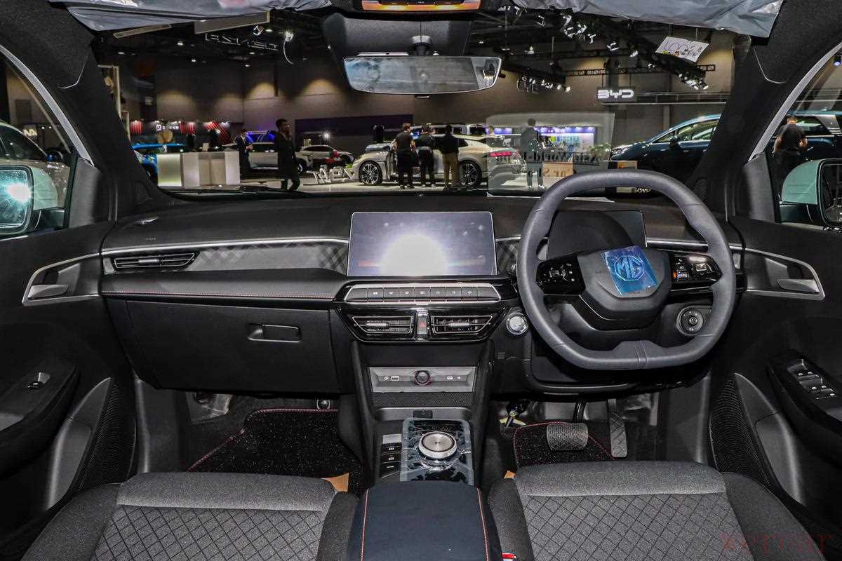 这次展出的车型为右舵版本,内饰布局和国内在售的MG5类似,悬浮式中控屏与独立全液晶仪表盘组成双屏系统。中控屏下方保留了部分实体按键,两幅式平底方向盘是偏运动的构造,中央扶手前方提供旋钮式换挡机构,座椅采用皮革和织物拼接而成,菱形缝线和橙色滚边,一定程度上提升了内饰高级感。