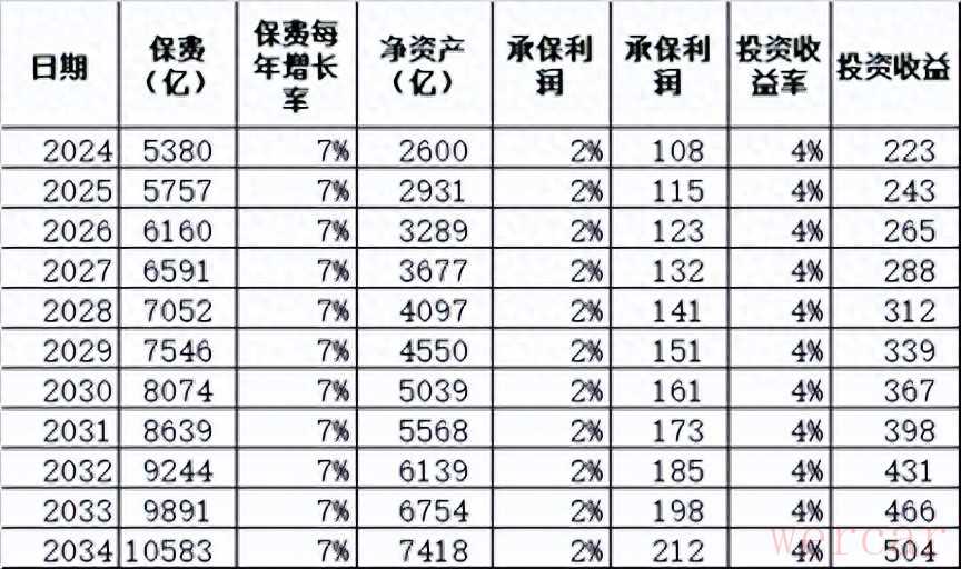 3.投资收益怎么算的,我用的公式是(保费+净资产)x70%x4%,这里之所以有一个70%是因为不可能所有保费和净资产都拿去投资了,我看了过往数据,用了一个大概值,也就是大概70%的会拿去投资。