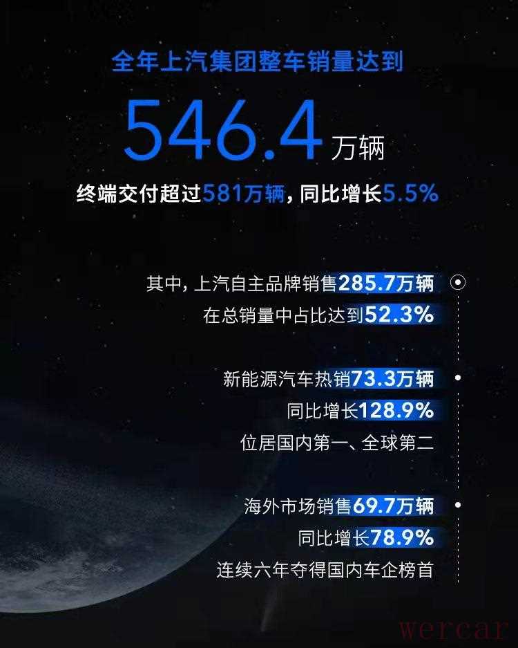 2021年,上汽通用五菱2021年销量166万辆,同比增长3.76%,上汽大通2021年销量23万辆,同比增长20.88%;上汽乘用车2021年销量80万辆,同比增长21.72%,是历年来的销量新高(其中,荣威品牌全年销量达37.7万辆,同比增长8%;MG品牌累计销量达47.2万辆,同比增长69%)。