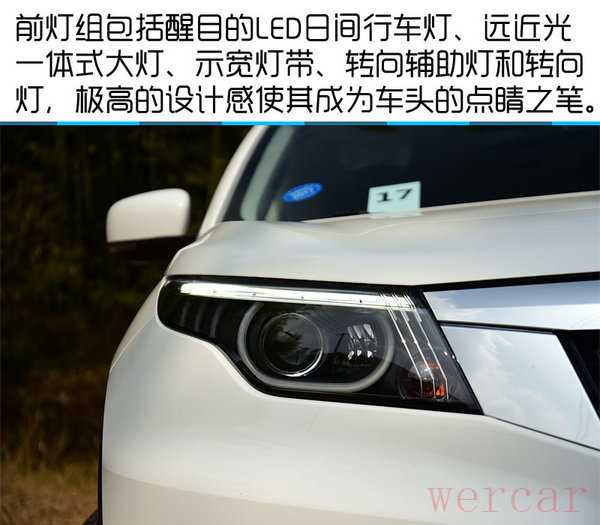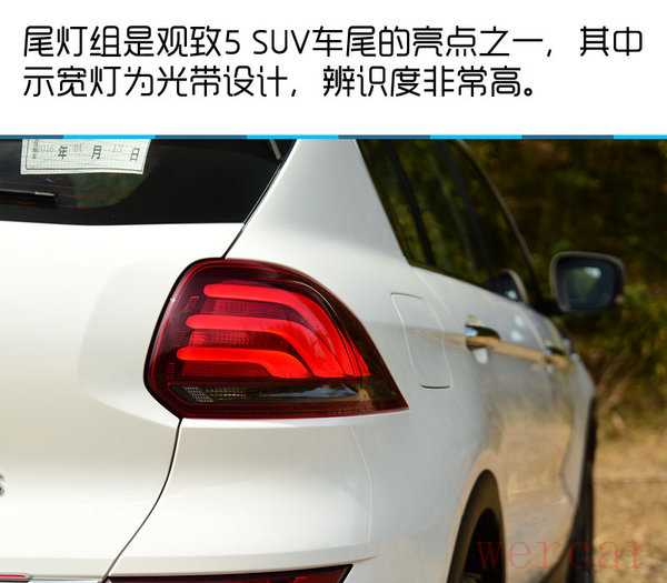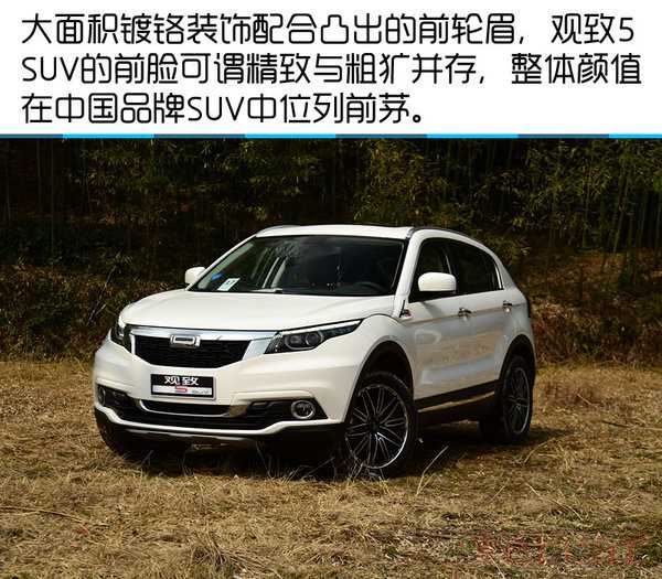 2. "设计语言时尚:" 外观设计方面,观致5 SUV延续了品牌一贯的“智潮”设计理念,线条流畅,造型时尚,符合当下年轻消费者的审美。车灯设计犀利有神,整体视觉效果比较前卫。