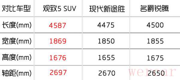 根据厂家的市场定位,观致5 SUV的竞争对手为马自达CX-5、现代新途胜等合资品牌紧凑型SUV产品,而综合动力、售价区间等各方面因素,名爵锐腾、纳智捷U6等中国品牌SUV也将成为观致5 SUV的市场竞争对手。从上面的车身尺寸对比可以看出,观致5 SUV的车身尺寸相比现代新途胜和名爵锐腾占据优势,但就同级别车型整体来看,其车身尺寸并不具备明显优势。