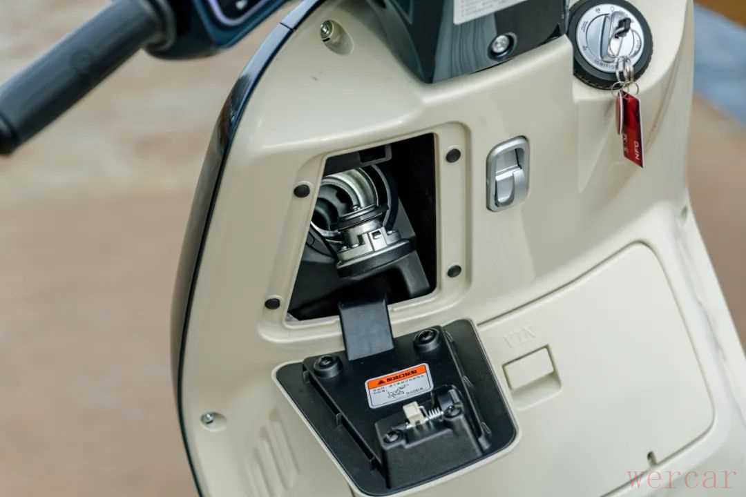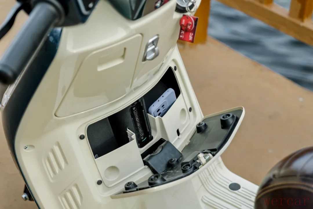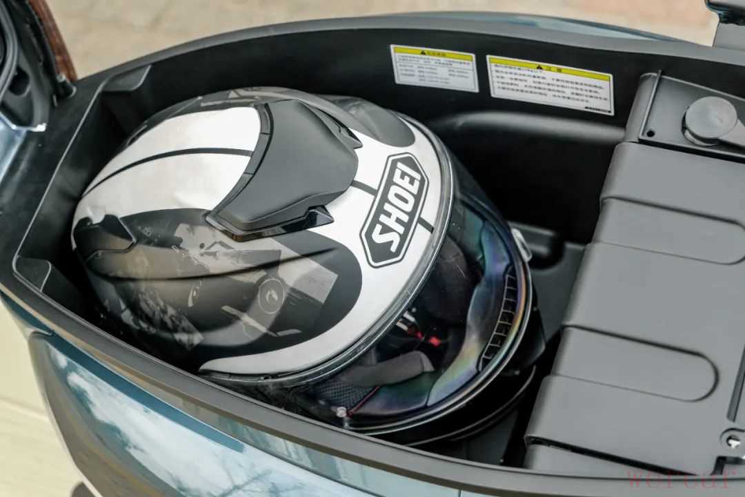 作为一款复古车型,这款车的储物空间算比较丰富了,由于前置油箱的原因,这款车的前储物空间不大,还被分成了左右两格,能放下手机或者一些杂物,右边带有USB充电接口。座桶空间相对较大,放下一定四分之三头盔基本没有问题,甚至像GT Air这种双镜片全盔也能勉强放下,对于一款复古150踏板来说,表现非常出色了。