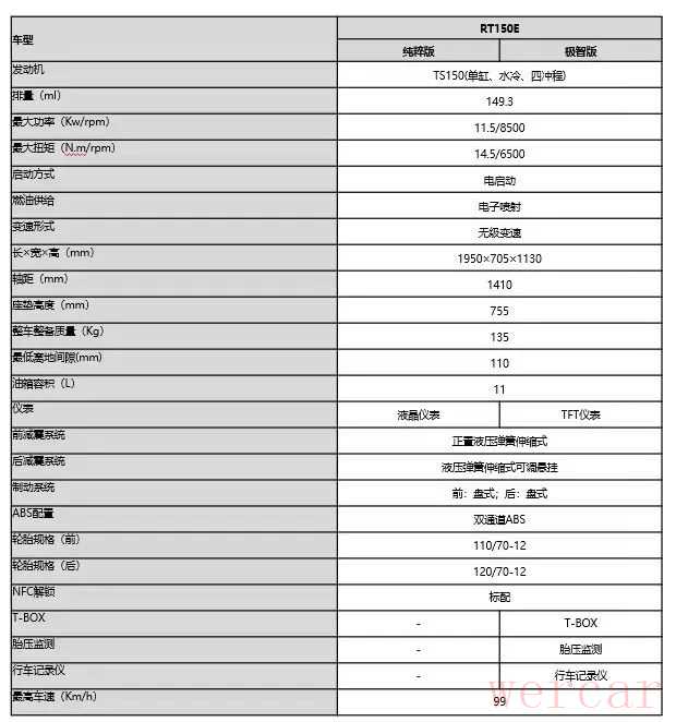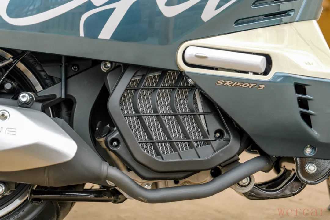 发动机是这款车的一大亮点,这款单缸水冷150mL发动机和自家的RT150同样属于TS150平台,最大功率11.5kW(8500r/min),最大扭矩14.5N·m(6500r/min),从动力参数上看,这款发动机的扭矩进行了向下调整,结合它11L的同级别大油箱,应该是为续航进行了优化,这款车理论续航能达到400km,不再有续航焦虑。同时考虑到这款车的定位和使用场景,配备了可关闭的自动启停,在使用中提升舒适感。
