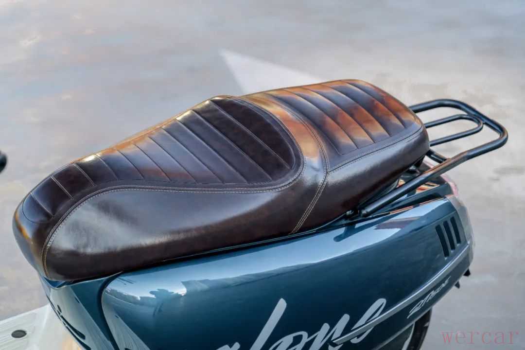 在细节装饰这款车也下了功夫,亮漆面和座垫的质感很有格调,配合脚踏板的撞色设计,复古和时尚风格并存。镀铬风格的后视镜和排气管罩在阳光下闪耀着金属光泽,彰显出复古的优雅气质。此外,这款车还采用了毛毛虫坐垫的设计,搭配做旧处理的棕色皮革,确实非常有复古的味道。
