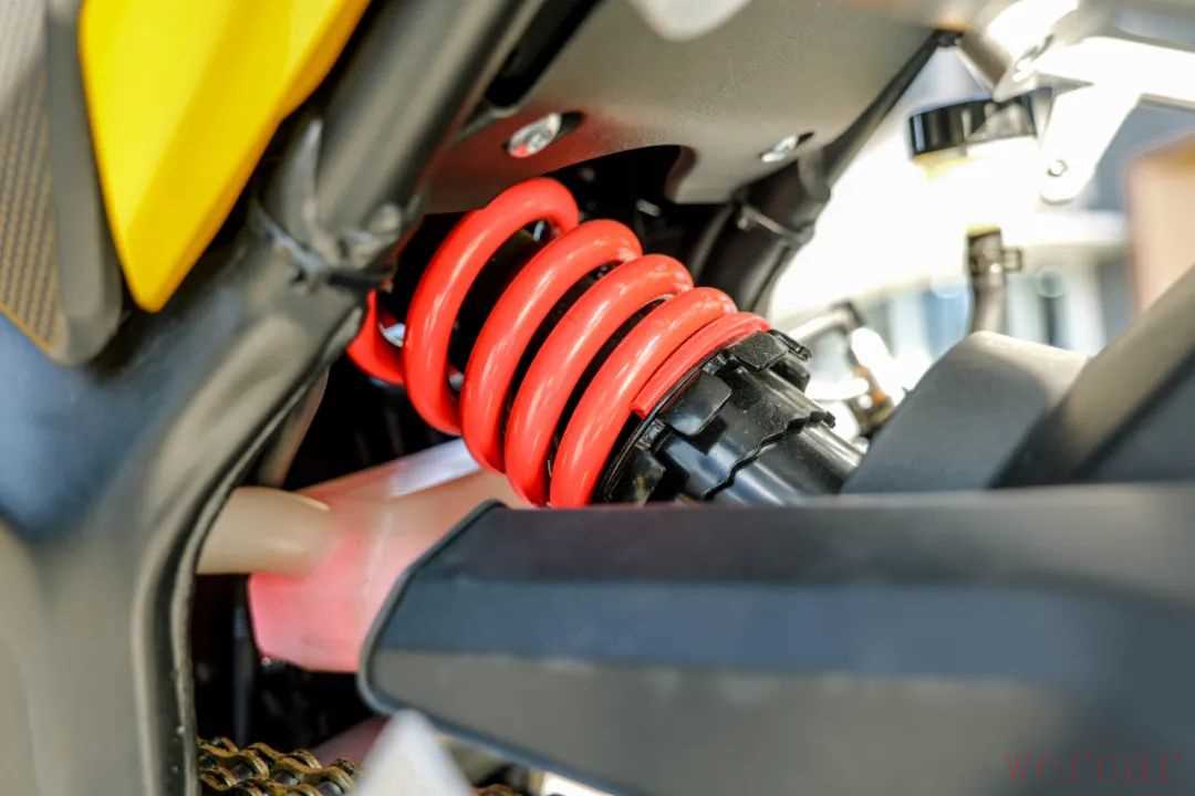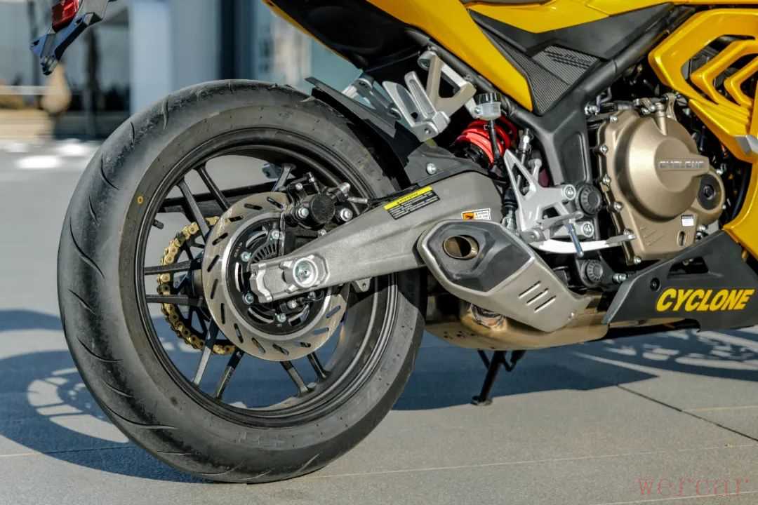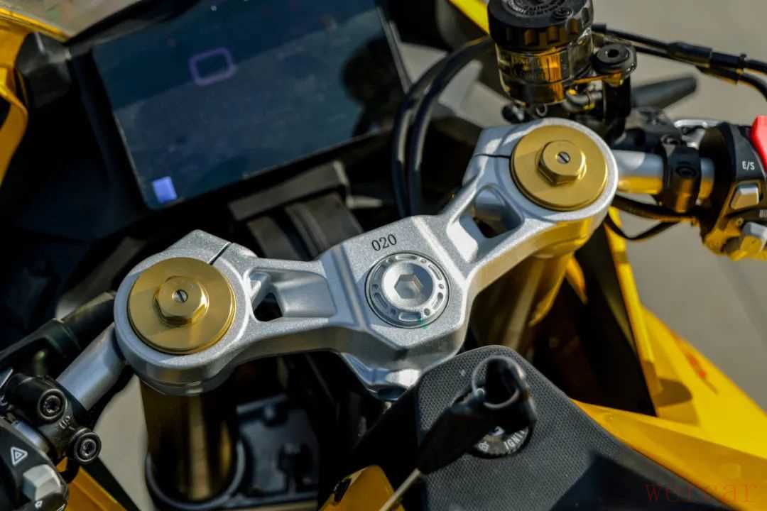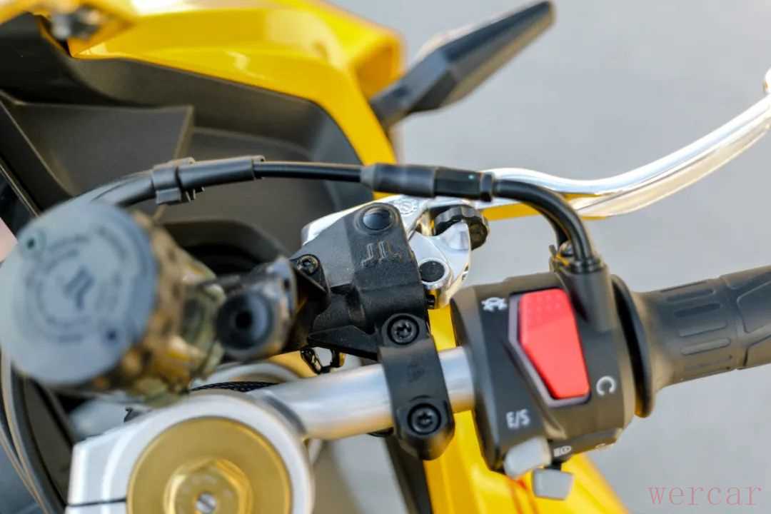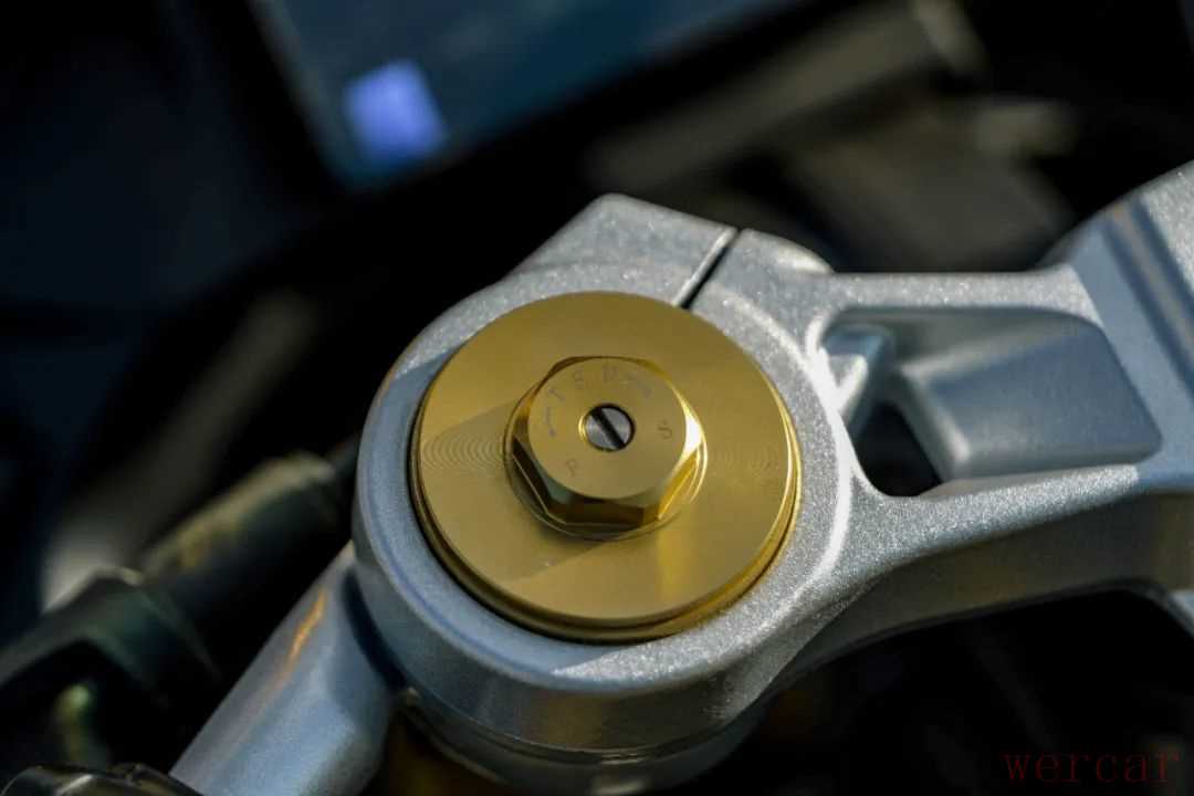 这款车的减震设计更多考虑了日常使用,原厂状态下后减震阻尼很软,应对城市环境下的颠簸算是比较舒适,但在运动驾驶中,原厂后减震的设置明显不太够用,需要调节阻尼甚至预载才能达到不错的效果。前减震的出场调校比较运动,结合调整后的后减震,这款车在运动驾驶时的支撑性很好,专业车手调校的车架搭配性能不错的减震系统,能很好的提升这款车的操控表现。同时得益于前轮单盘减少的簧下质量,在快速转向和倾倒时,这款车非常轻松,再加上186kg的整备质量,能让人很轻松上手。