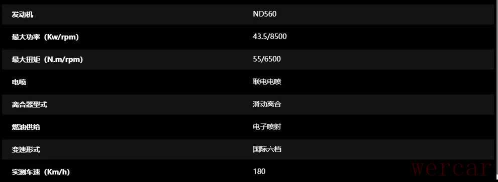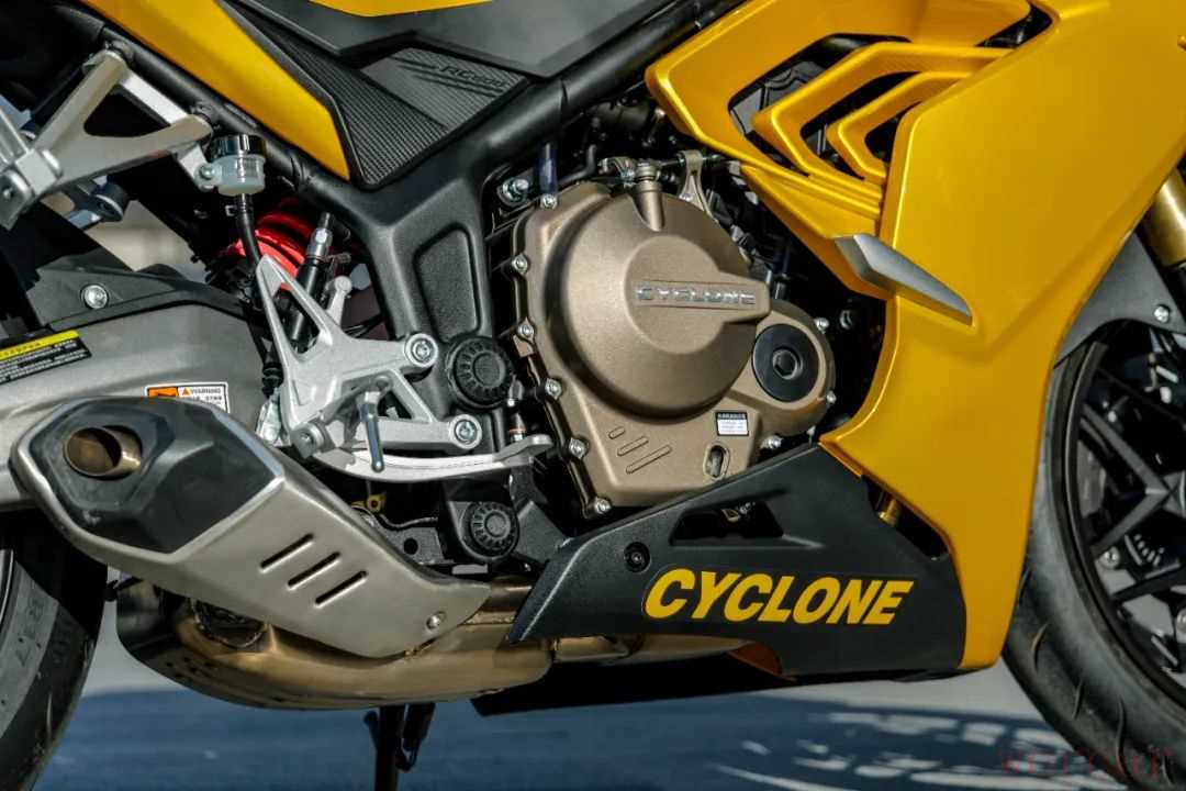 动力上采用诺顿ND560双缸水冷发动机,这款发动机在技术上十分成熟可靠,其实际排量为550.4mL,最大功率43.5kW(8500r/min),最大扭矩55N·m(6500r/min),这款发动机特点十分鲜明,从参数上看发动机在中低转速下扭矩表现优异,在一款仿赛车款上还是比较少见。