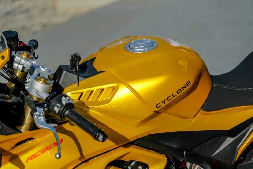 整车的骑行三角运动感很强,分体式车把固定在上联板下方,车把的高度较低,油箱的加持感很好,再加上相对较高的脚踏位置,RC600原厂的骑行三角能让你在日常驾驶中充分体验运动车款的驾驶姿态。为了应对更多人使用方便,这款车的座高设计为了790mm,配合座椅收窄设计,使得不同身高的骑手都能轻松地双脚全脚掌着地,这样的设计降低了上手门槛,提高了骑行的舒适性和信心。
