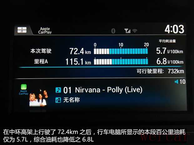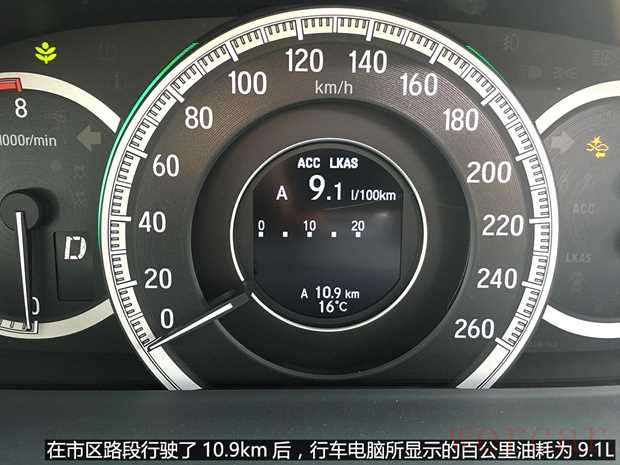 与前几次油耗测试所不同的是,此次测试过程中,市区路面并没有遇到以往常见的车辆大量积压现象,除了常规的红灯之外,甚至没有多余的等待时间,而在市区路面走走停停的情况下,新雅阁行车电脑所显示的油耗为9.1L,鉴于它2.4L的大排量,这样的成绩倒也并不丢人。
