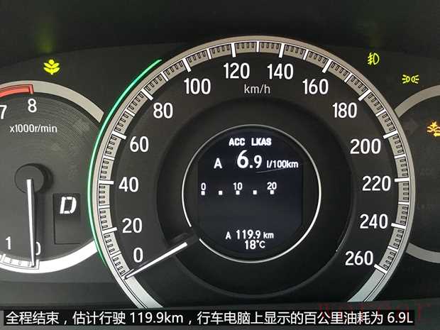 测试了近一天之后,当笔者将它滨河路加油站,看了一下行车电脑显示屏,全程一共行驶了119.9km,此时行车电脑所测算的百公里油耗为6.9L,实际的消耗燃油量为8.26L 92号汽油,约合下来实际的百公里油耗为6.89L;说实话,在测试前笔者一度以为它的百公里油耗会在8-9L之间徘徊的水平(毕竟这也是一台标准的2.4L排量中级车嘛),参照新雅阁65L的油箱容积,看来一箱油跑1000km对于新雅阁而言还是相当轻松的!