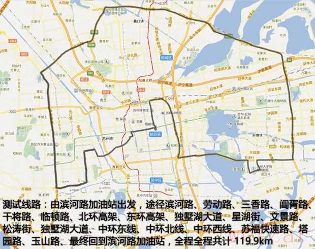 先来看一下我们的油耗测试路线,以滨河路加油站作为起点,途经滨河路、竹园路、劳动路进入古城区,途经三香路、阊胥路、干将路、临顿路这些最拥堵的路段,进入北环高架、南环高架、独墅湖大道、途经月亮湾再到中环快速路,环苏州半圈驶入苏福快速路、再次回归地面,途经塔园路、玉山路回到我们的起点滨河路加油站,全程共计117.4km;这条线路基本兼顾了日常用车、偶尔跑个远路郊游等汽车用户常规使用范畴。
