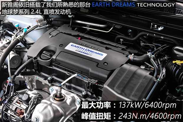 新雅阁所搭载的还是我们所熟知的那台2.4L地球梦科技系列发动机,配备了缸内直喷技术以及本田看家的i-VTEC智能可变气门正时系统,最大功率137kW/6400rpm,峰值扭矩243N.m/3900rpm。
