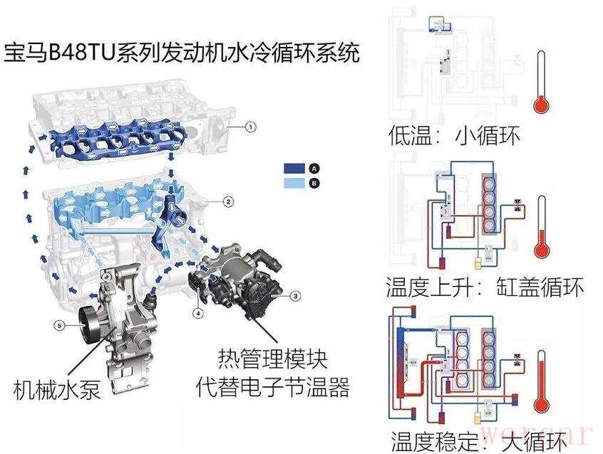 那么咱们接下来一个一个展开说,先说“三循环”策略,熟悉车辆的网友们应该知道发动机的大小循环,会根据发动机的工作温度通过电子或石蜡节温器切换循环模式。