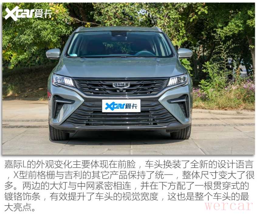 嘉际L的外观基于吉利最新家族式设计语言打造,大胆地加入了跨界元素,融合了轿车、SUV以及MPV车型的诸多特点。多种元素的组合叠加对设计要求相当高,稍有不慎就会显得杂乱,不过从结果上看,吉利的这次尝试应该说还是非常成功的,做到了和谐美观。