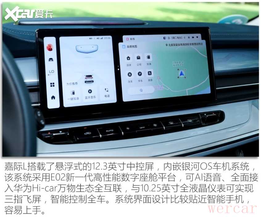 进入车内,嘉际L的内饰设计给我留下了深刻的印象。整体布局清晰,做工精细,用料也相当不错。嘉际L采用了双12.3英寸的联屏设计,科技感十足。中控台部分,嘉际L采用了平底式设计,搭配旋钮式换挡机构,操作起来非常便捷。最让人惊喜的是嘉际