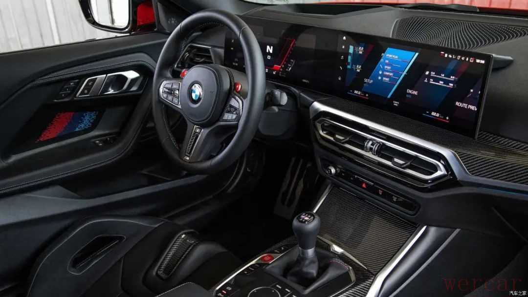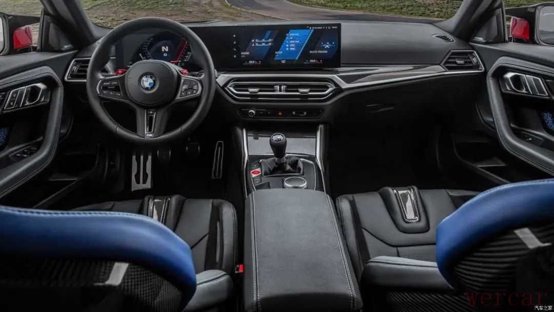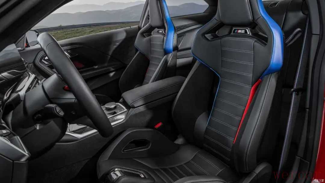 进入车内,全新宝马M2毫无悬念的采用了最新的iDrive 8车机系统,与之相匹配的是全液晶仪表盘与中控多媒体显示屏相连接的曲面双联屏,带有换挡拨片和M选择按键的三辐式多功能方向盘和经典的鸡腿是电子换挡机构也凸显出了M车型的极致运动气息,再加上新车在车门扶手处的M三色光脉饰条、可选装的M3/M4同款的碳纤维桶型座椅,让车内的战斗氛围直接拉满。