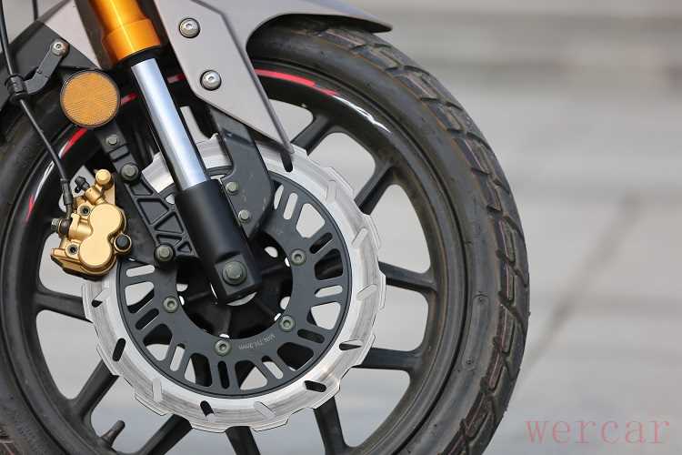 前双活塞卡钳,风火轮大盘碟刹,制动效果不错。另外,被很多人吐槽的土豪金色前避震在后面出厂车型上已经被换掉了。