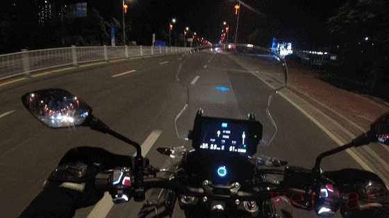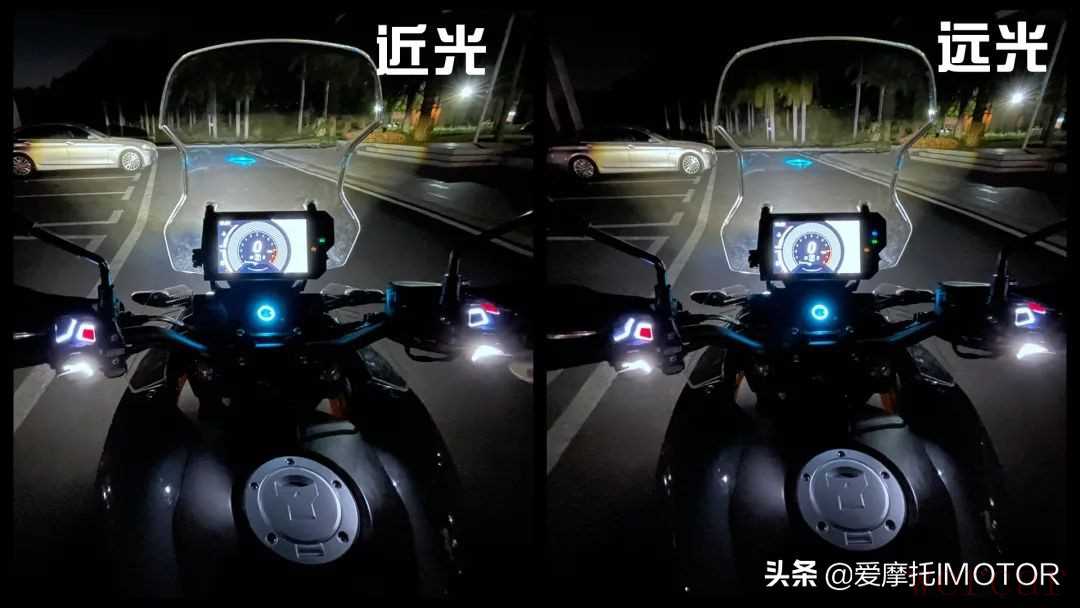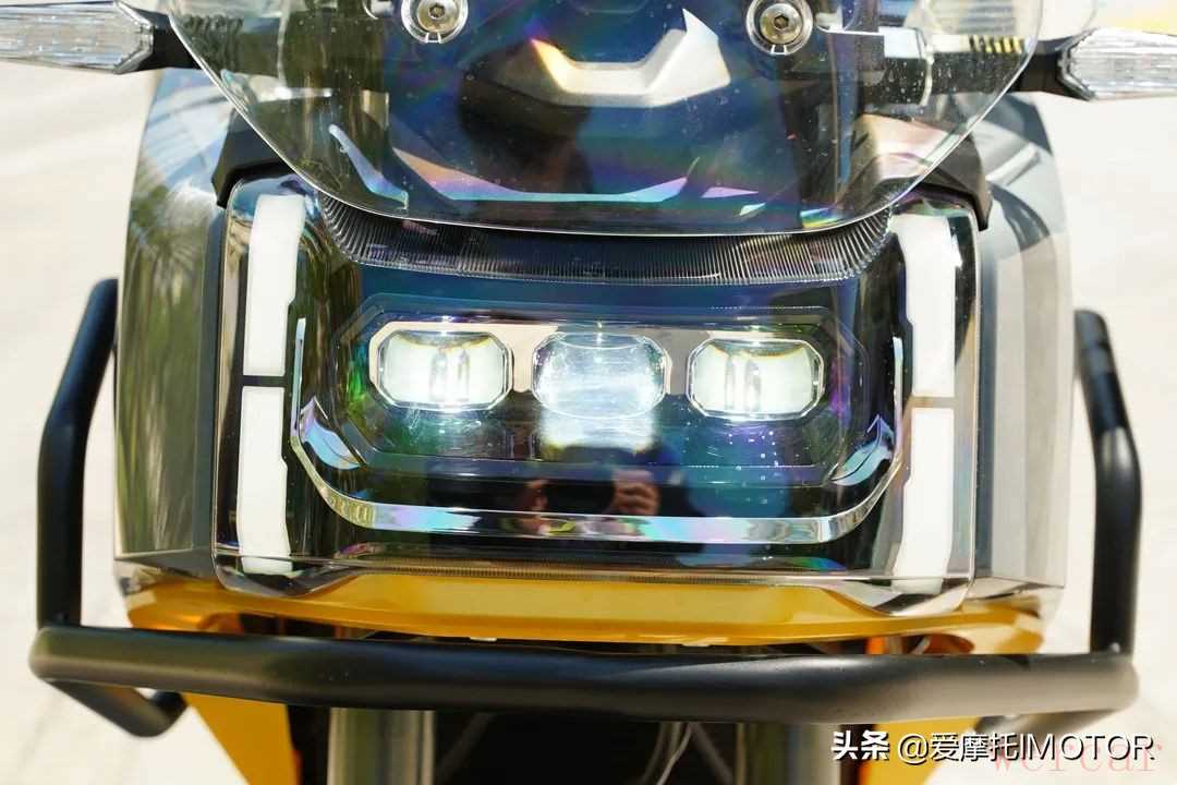 大面积的车头除了视觉上突出,其实也为大灯的设计留下了更充足的空间,KPT400的矩阵式大灯呈一字排列,内含三颗带透镜的LED灯珠,两边则是LED日间行车灯带,夜间照明效果挺好的,无论是光照范围还是亮度都不错,唯一有个问题就是感觉近光灯的角度稍微偏上的一点,夜间同事在我前面骑得时候,他总以为我开了远光灯。