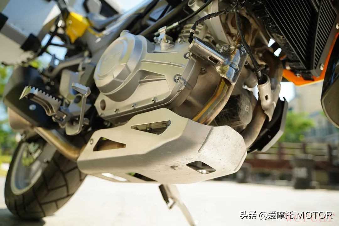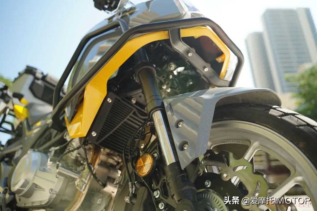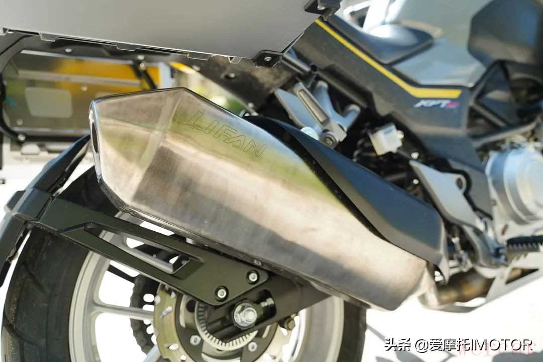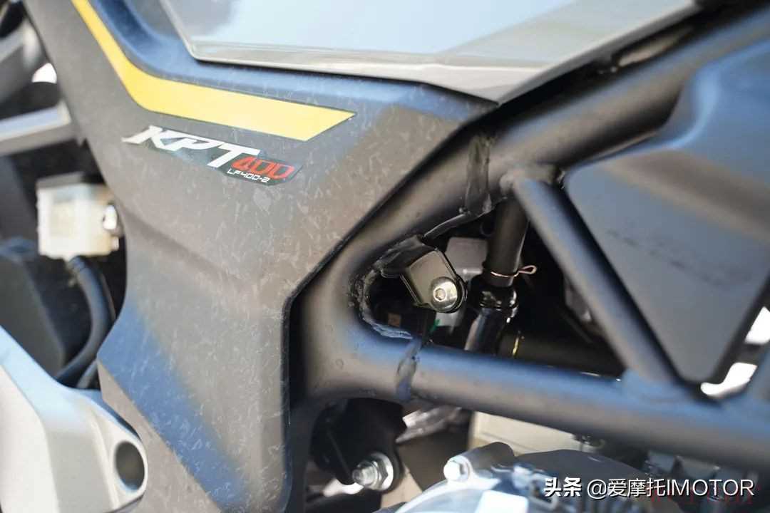 原先会觉得这个大块头导流罩可能会显得车头内部很空,但你实际去从底下看时会觉得还好,从油箱的位置有向内收紧。另外我比较喜欢它这个无缝焊接的不锈钢排气管,造型好看,声浪也比较浑厚。不过我不喜欢它在车架上的细节处理,焊接得不太规整,感觉还有提升空间。