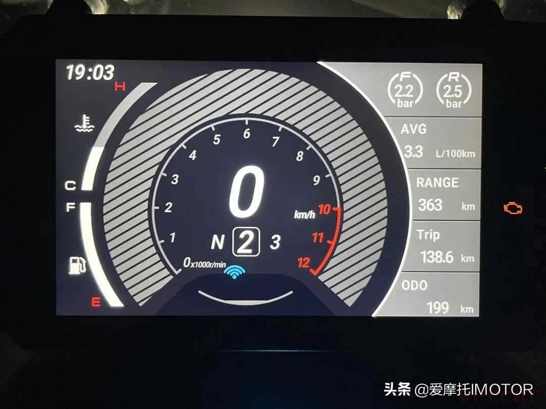 大尺寸TFT液晶仪表在显示效果上非常出彩,包含转速时速/油量/时间/档显/平均油耗等多组直观信息,并且胎压监测数据也集成在上面,也能根据设定自动背光模式,日间夜间都能准确读取信息。