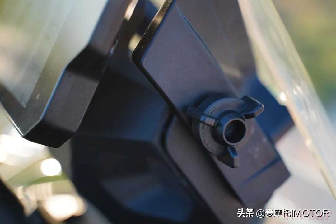 其实这种大面积车头一体化的设计也不是没有好处,KPT400在风阻保护的效果上给了我很好的印象,行驶过程中,很大一部分腿部迎风面都被这个硕大车头保护了,并且原厂配备的风挡面积也很大,升到最高位时基本上上半身的风压都能够挡住,只有头顶能吹到一点风,风挡手动可调,但是调节需要松开两边旋钮,做不到骑行时单手快速调节。