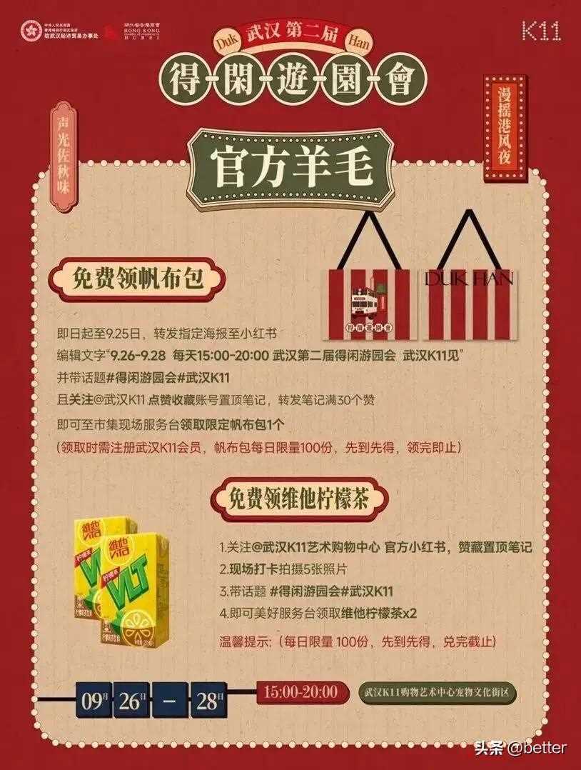 作为主办方,「得闲游园会」一出手就上大分。300份限定帆布包免费送,600份维他柠檬茶现场畅饮,更有限量300份早鸟套票仅需9.9元(含限定杜邦纸包+2张5元无门槛券),玩得很“香港”,但物价还是咱武汉的物价。
