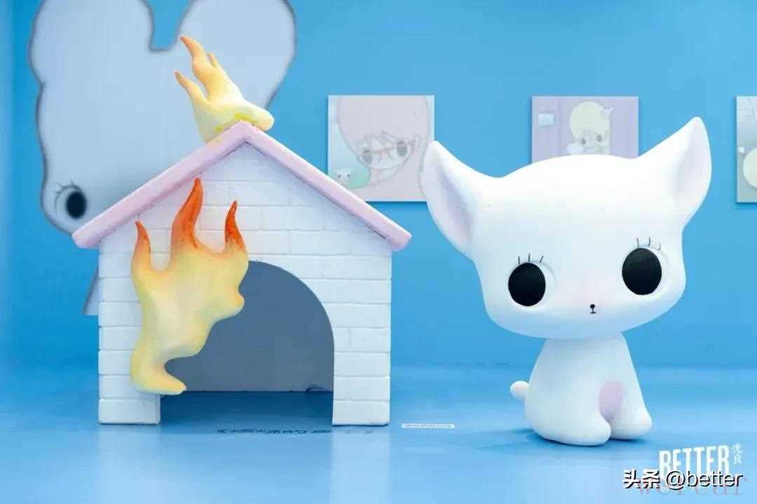 展厅被打造成沉浸式治愈系空间,金鱼缸、燃烧的房子、兔子玩偶......与近百幅经典插画达成相辅相成的奇妙效力,每一幅都像在轻拍你的肩,抚慰着你。