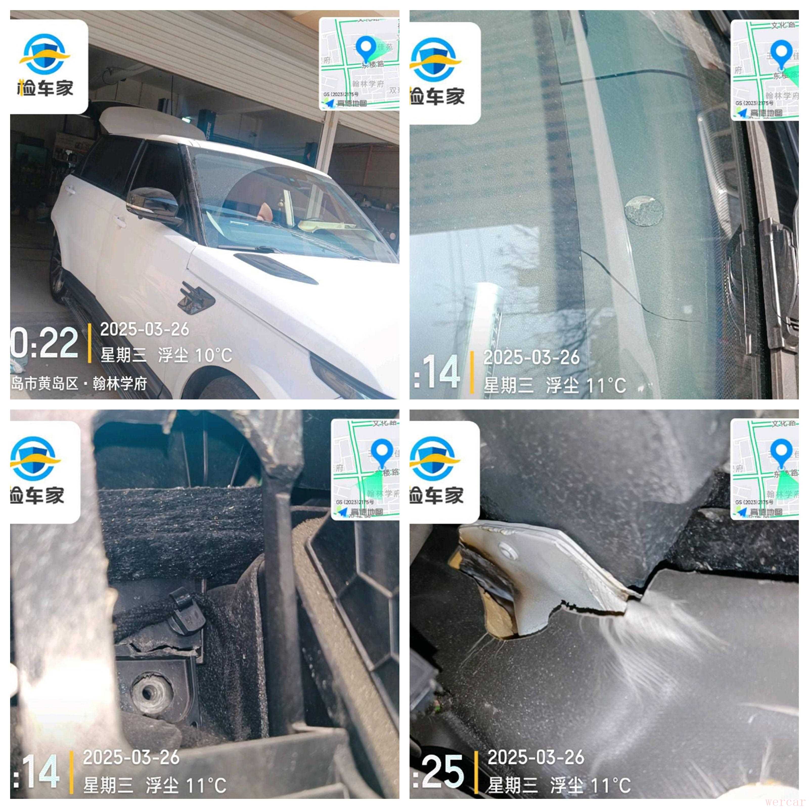 同时碰撞时应该是有重物砸在了工作台右前方的位置,导致了机盖、工作台、挡风玻璃的损伤,同时损伤到了防火墙。