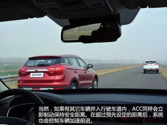在巡航状态下,如果前方没有车辆,系统会按照驾驶员预先设定的速度匀速前进。如果前方出现了车辆,系统则会以预设的车距为准来控制车速。吉利博越的ACC来自博世制造,当车速超过30km/h后,系统才能启动。