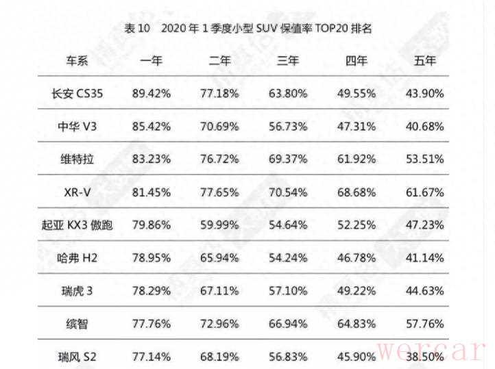 不过从实际情况来看却并非如此,比如在网上就有一份针对不同车型的保值率的统计排名。以小型SUV汽车为例,排名第一的是长安CS35,它的第1年保值率是89.12%,第2年保值率是77.18%,第3年保值率是63.80%,第4年的保值率是49.55%,第5年的保值率是43.90%。