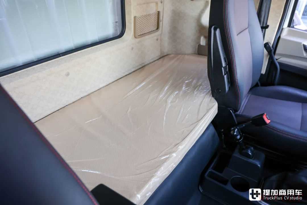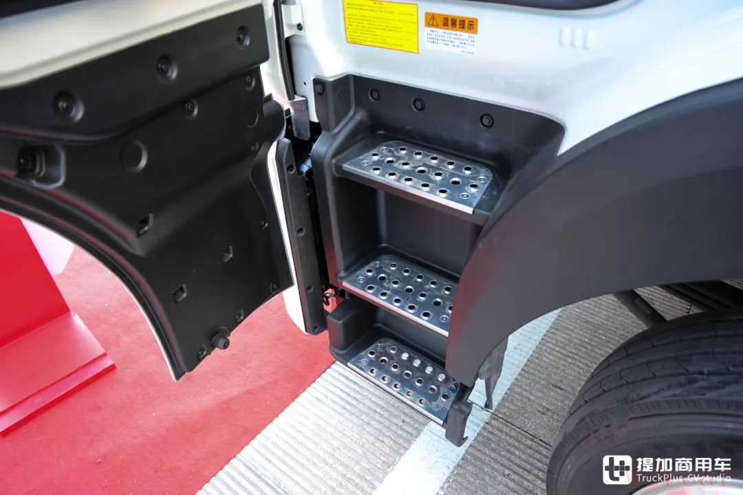 看完车外各项配置,接下来就让我们进入驾驶室。拉开车门后,三级登车踏板映入眼帘。它们如同台阶一样依次向内收缩,更便于登车。踏板采用金属材料,上方带有防滑打孔,提升耐久性及安全性。车门下摆进行延长,可将登车踏板收纳在内,有助于降低空气阻力、减小风噪,这对油耗表现及驾乘舒适性也有所增益。