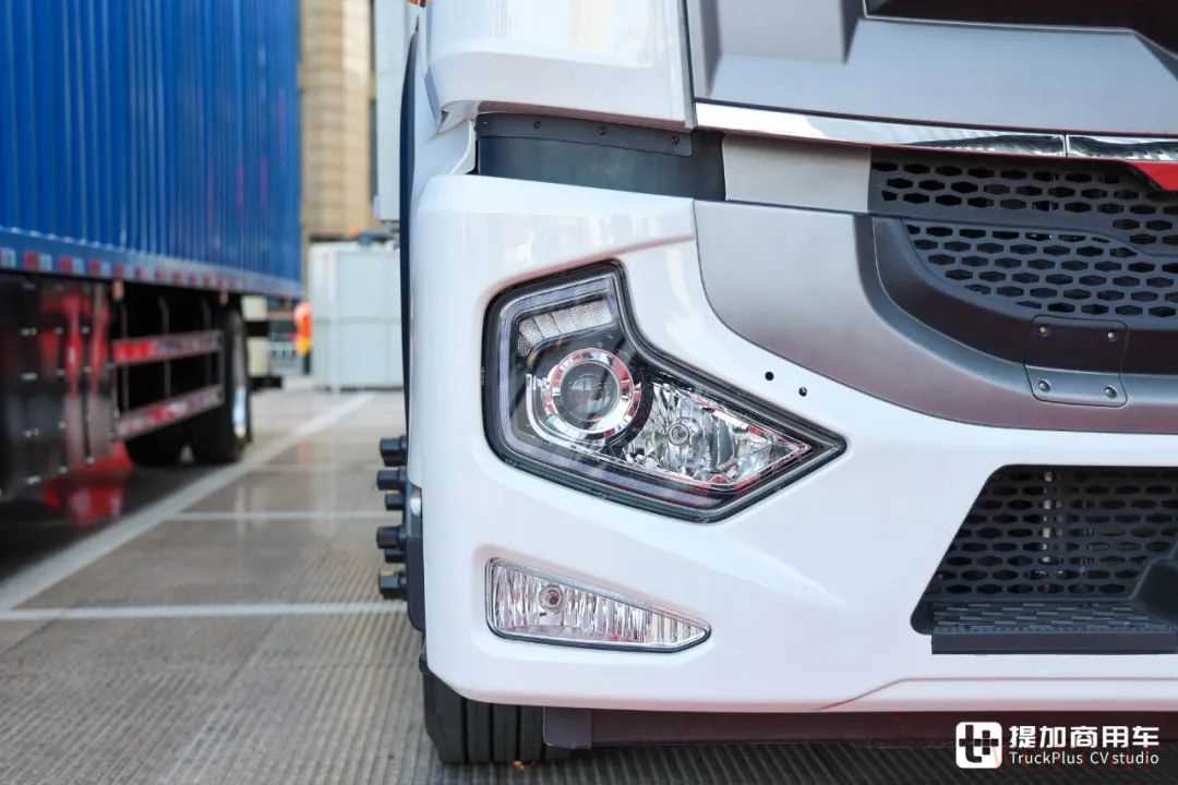 在各大国产卡车之中,江淮格尔发A5X的外观设计可谓标新立异,极具辨识度。它的前脸以U型的前面罩为主要元素,由两道银色镀铬装饰条分为上中下三段,如同“腹肌”一样具有力量感。黑白灰三色交相辉映,附加镀铬饰条装点,精致的造型带来深刻的印象。