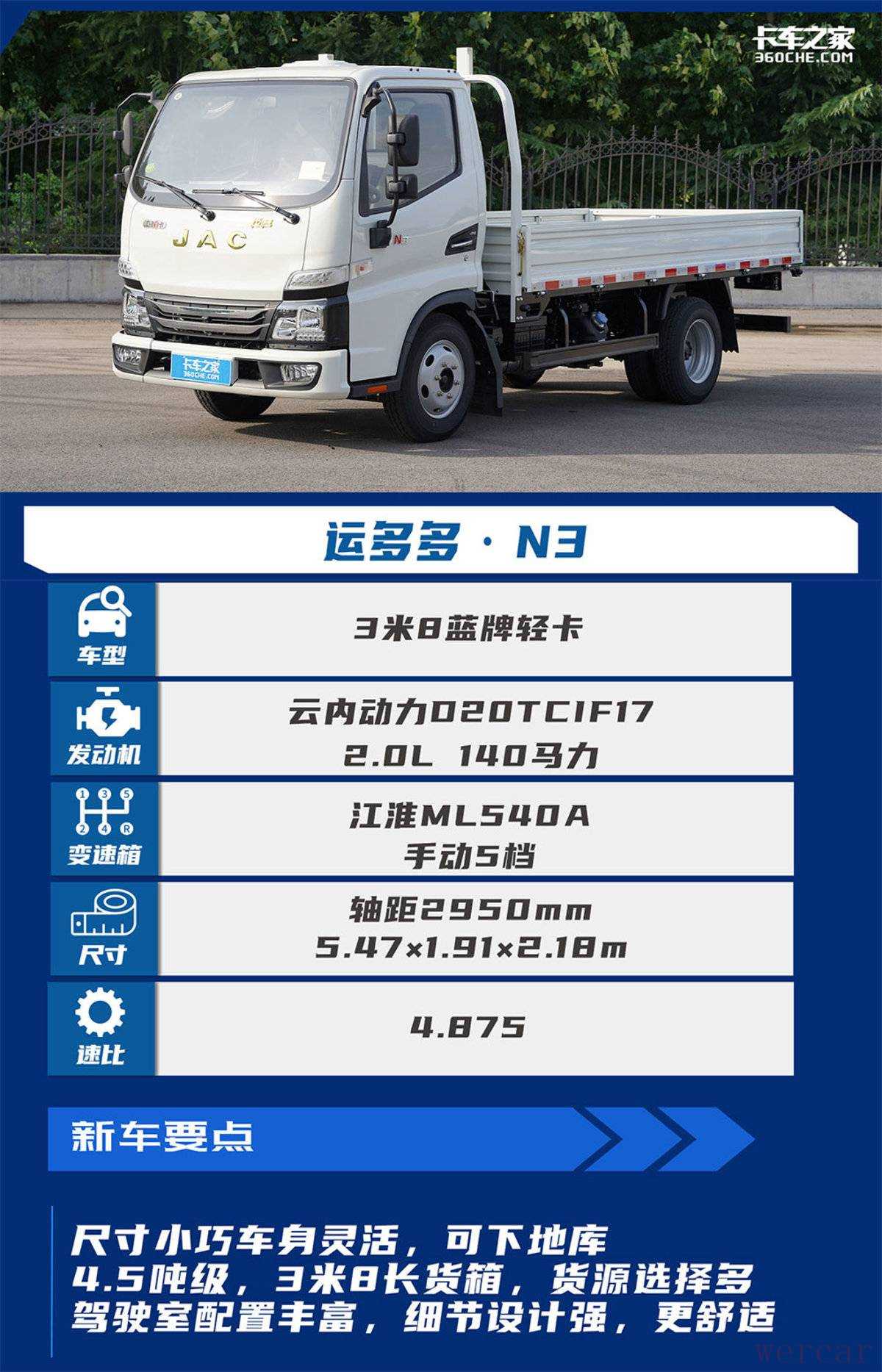 那么有没有一款车型既能满足我们的灵活性需求,又能做到承载能力强悍,驾乘更加更舒适呢?近期,江淮1卡推出了全新的运多多·N3车型,这款车不仅做到了4.5吨级,还拥有3800mm长的货箱并且能下地库,可以说能装又灵活。