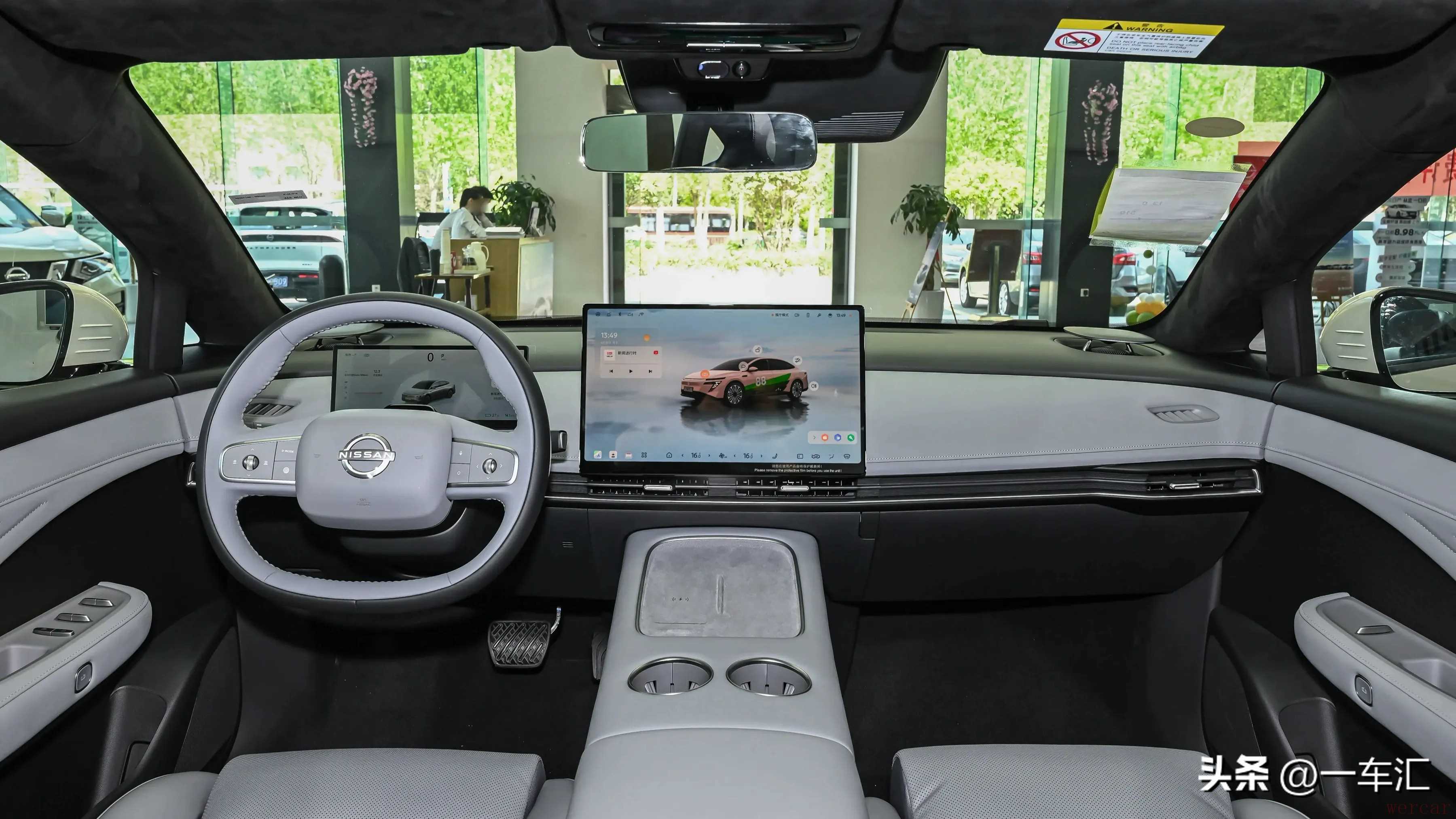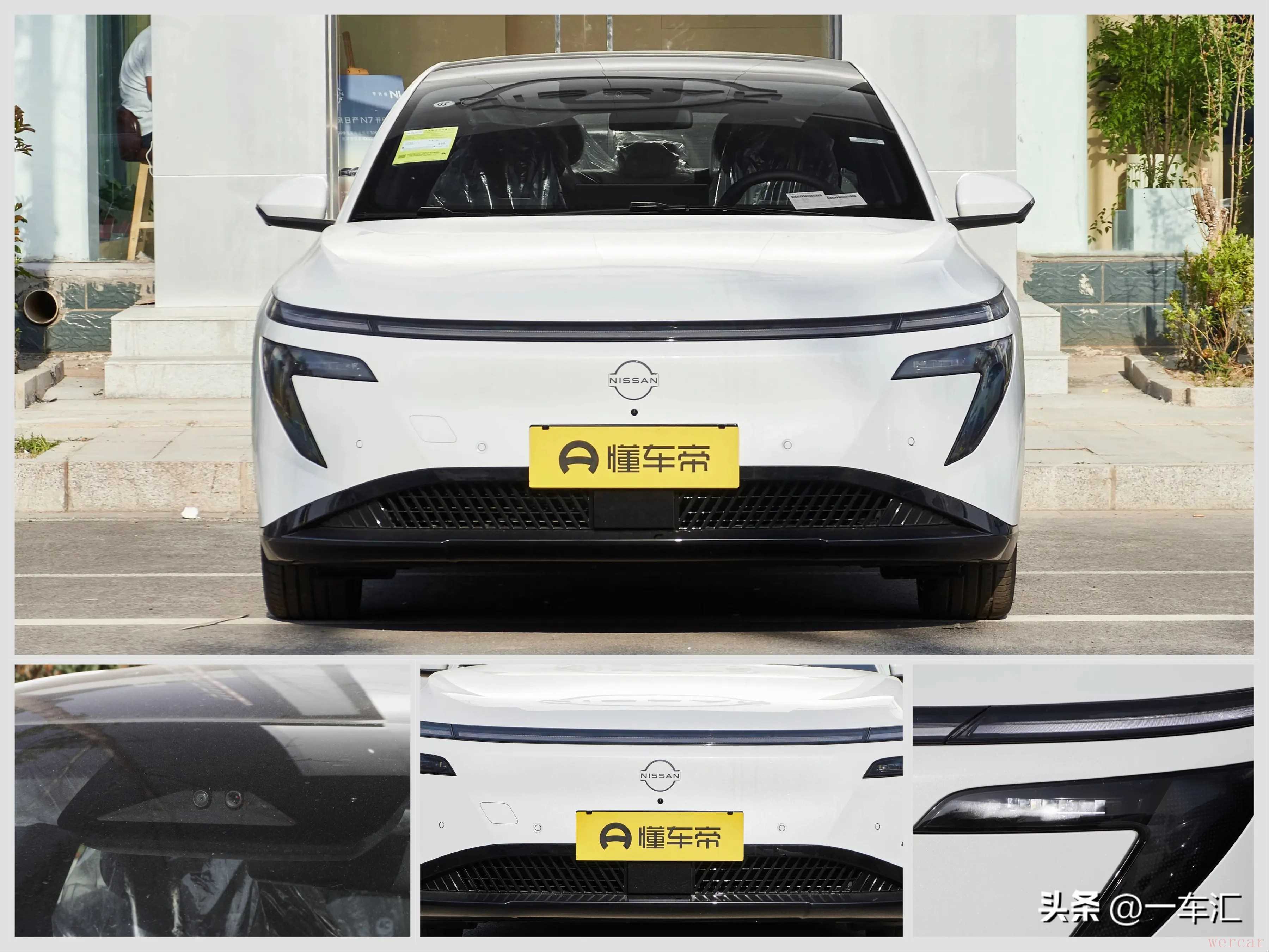 车头前脸采用封闭式设计(没有传统燃油车的进气格栅),符合电动车的特点,中间搭配贯穿式LED灯带和可发光日产车标,夜间点亮后辨识度超高。大灯是分体式设计,上方细长的日行灯与下方的镰刀状主灯组形成对比,搭配黑化的梯形装饰条,既运动又有科技感。智能灯语系统是亮点,前大灯和尾灯能通过710颗LED灯珠和882个OLED发光单元显示自定义文字或图案,比如节日祝福或个性化签名,互动感十足。