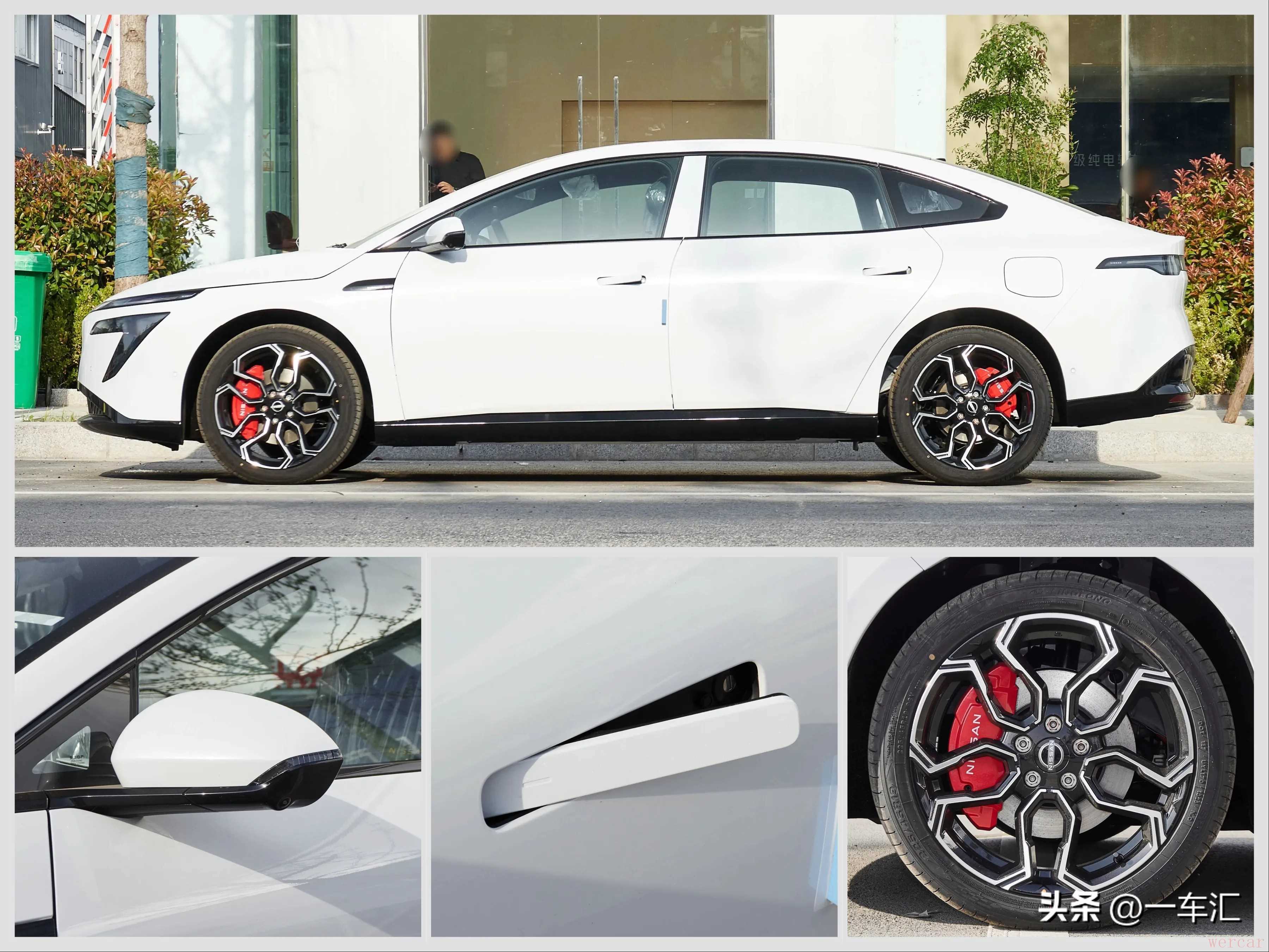 侧面线条流畅又优雅,采用溜背造型,车顶从B柱开始自然下滑到车尾,既动感又保证了后排头部空间。无框车门、隐藏式门把手、隐藏式腰线,再加上蚌式机盖(引擎盖与车身无缝衔接),整体看起来干净利落,风阻系数低至0.208(接近奔驰EQS的水平)。车身长宽高为4930mm/1895mm/1484mm,轴距达2915mm,超过了日产品牌在售的燃油中型轿车天籁(长宽高4906/1850/1447毫米,轴距2825毫米),接近于比亚迪汉EV(长宽高4995/1910/1495毫米,轴距2920毫米),定位于中大型车。侧面采用3倍轮轴比(轴距是轮距的3倍),搭配0.618黄金比例分割设计,视觉效果优雅舒展。轮毂有19英寸低风阻多条辐轮圈或五辐花瓣轮圈可选,搭配红色刹车卡钳,运动感拉满。