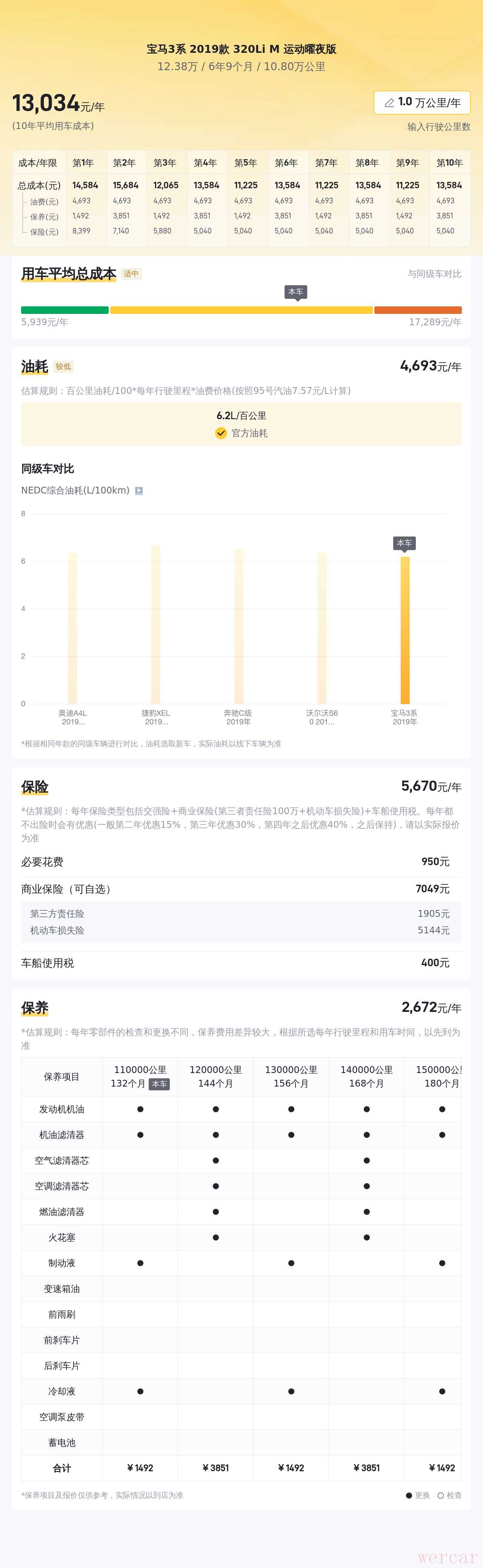 根据懂车帝的数据,这辆宝马3系2019款320Li M运动曜夜版的二手车报价为12.38万元。在当前车况下,这一价格相对合理,但具体价格还需要根据车辆的实际状况和市场行情进行综合评估。潜在买家在做出购买决策之前,建议对比同类车型的市场价格,以确保获得合理的价格。关于用车成本方面,懂车帝大数据分析得出,这辆宝马3系2019款320Li M运动曜夜版的平均用车成本为每年13,353元。这一数字涵盖了燃油、保险以及保养等常规用车支出。然而,实际用车成本可能会因个人驾驶习惯、车辆维护状况和地区差异等因素而有所不同。潜在买家在考虑购买时,应将这些额外成本纳入预算规划之中。