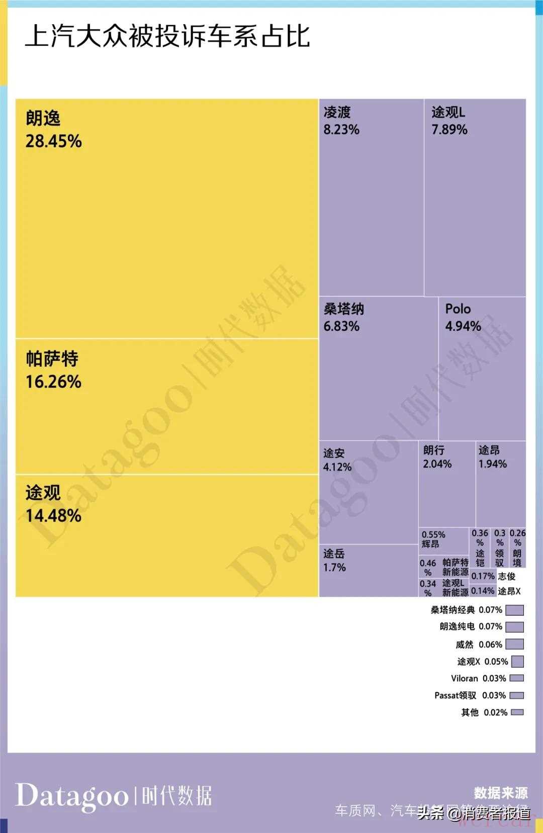 分析发现,朗逸车系投诉记录最多,占比 39.9%,帕萨特和途观位居第二及第三,各占比 16.26% 和 14.48% 。