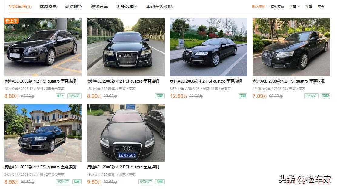 上面这台A6L就是今天咱们要检测的这台,买车的是一位微胖的小伙儿,看着年纪不大但面相比较老成,我们暂且称呼他为阿柳。阿柳看中这台车不一般,这是一款4.2L排量的旗舰车。而我们常见的是2.0和3.0两个排量,4.2L的就非常稀有了,在某二手车网络平台上,全国只有6台车源,所以,这款车不太好买。