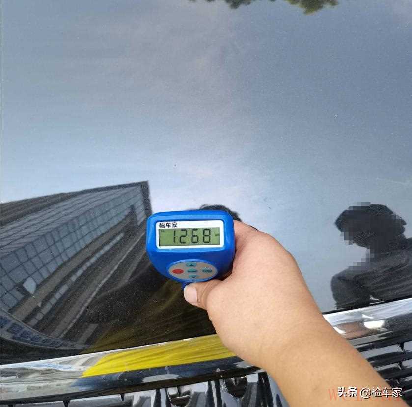 前机盖的漆面够亮吧,反射出来的影子清晰可见。不过这么亮的漆面却是后做的,1268um的漆面厚度出卖了它,这个数值意味着前机盖有过钣金修复喷漆,结合前保险杠的情况,前部不能放松警惕。等下检测发动机舱的时候要留意一下。