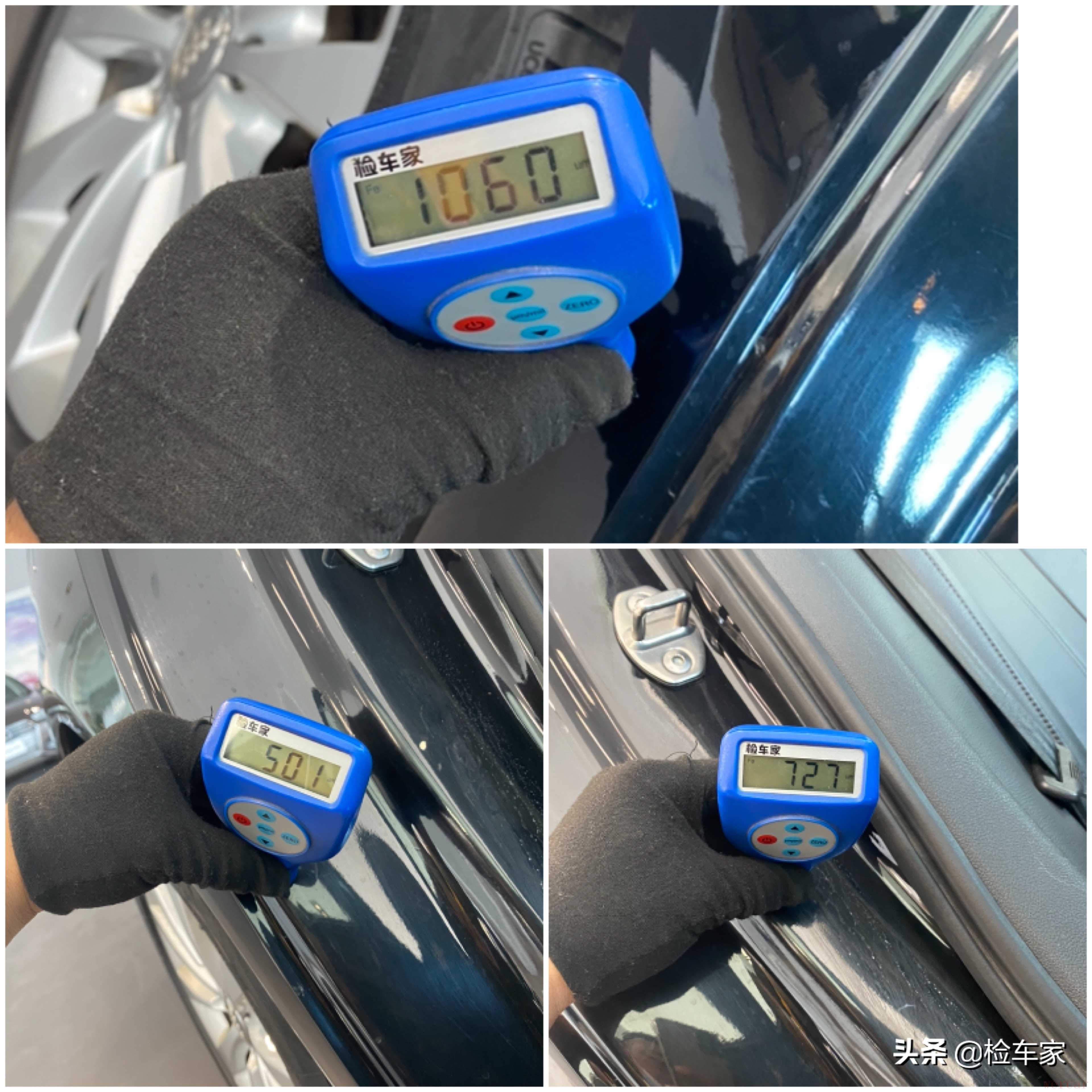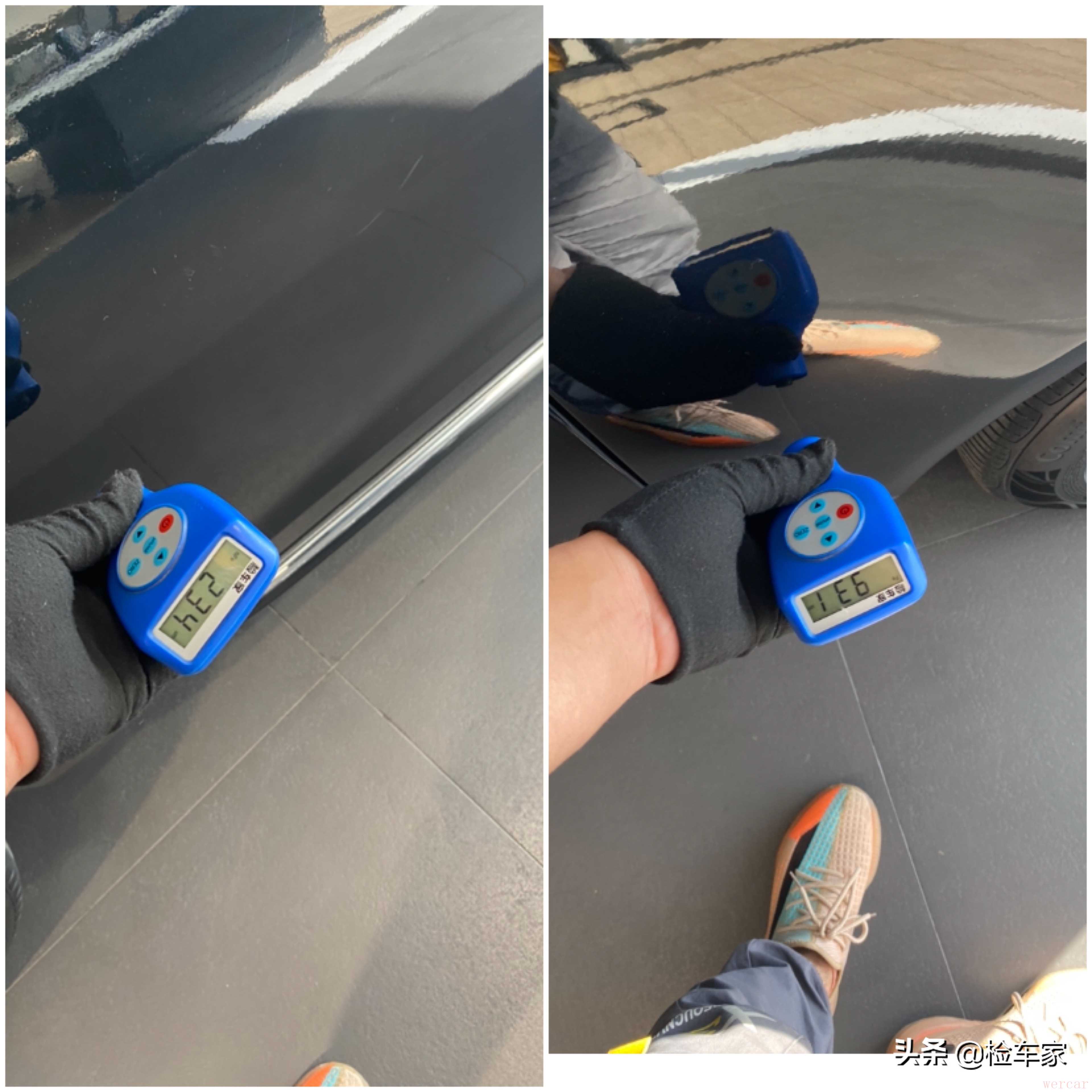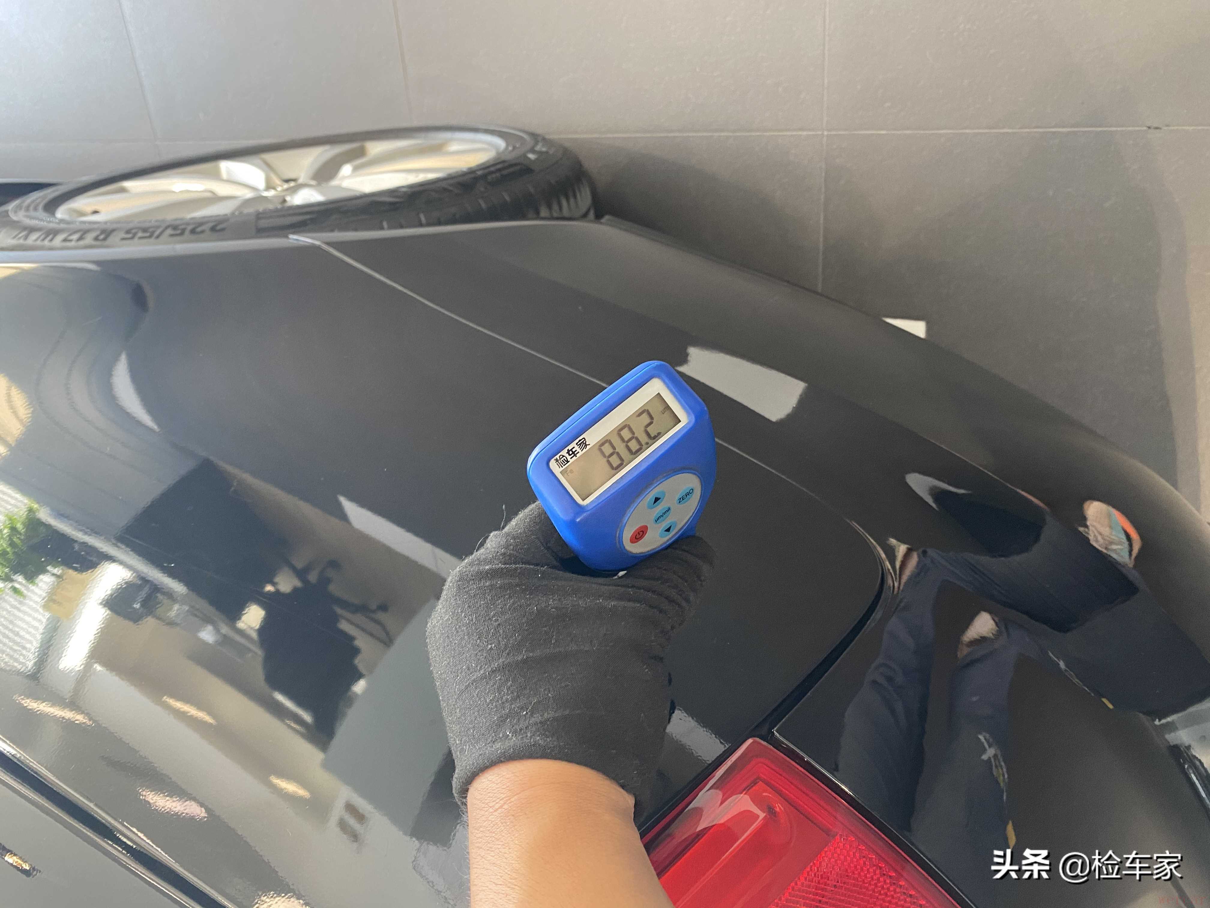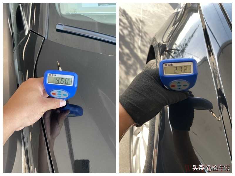 首先还是先用肉眼观察,发现左前门剐蹭掉漆有划痕;左后门剐蹭;这些小瑕疵对于一辆5年14万公里的二手车来说可以忽略不计了,不过这已经是做过抛光处理了,伤到底漆不好处理除非两个门整个喷漆但个人觉得没那个必要,可以先开着。下面拿出专业设备检测漆面具体情况。