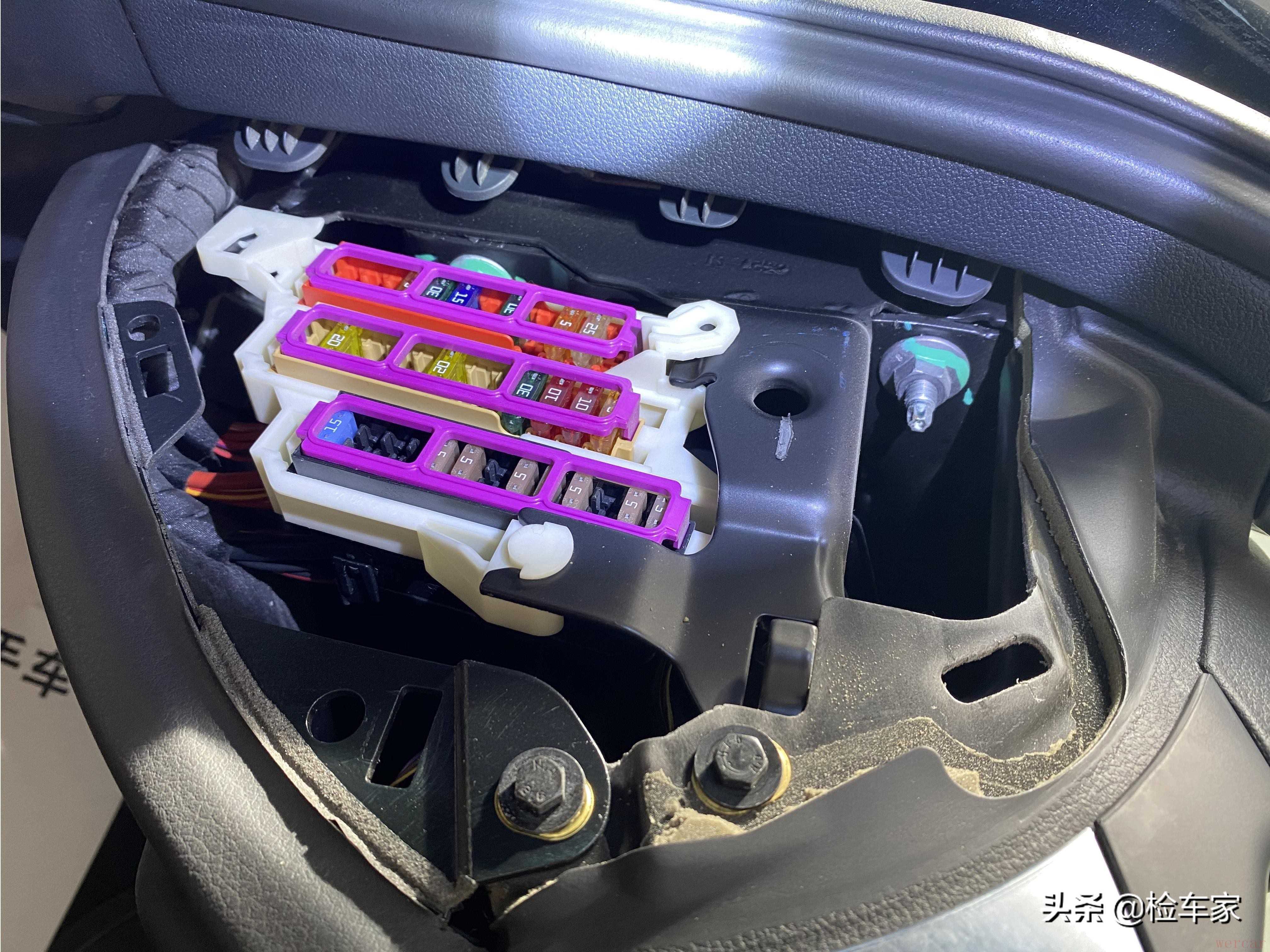 然后我用专用工具撬开左侧中控台饰板,发现电器盒无腐化无泥沙,保险丝规整有序,中控台骨架固定螺丝包括中控饰板固定螺丝无任何拧动的痕迹。