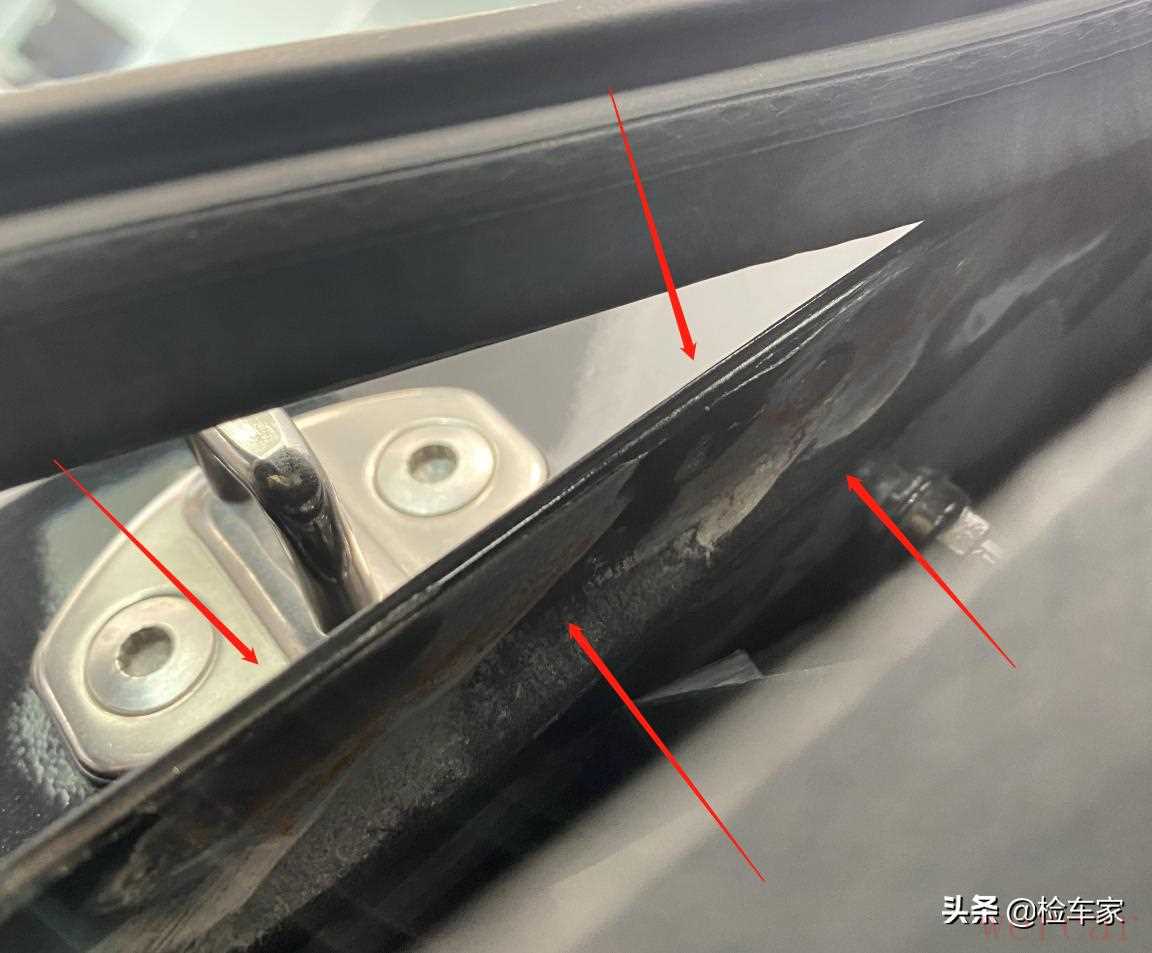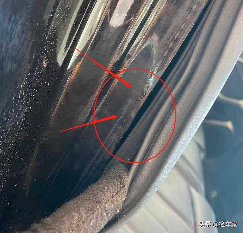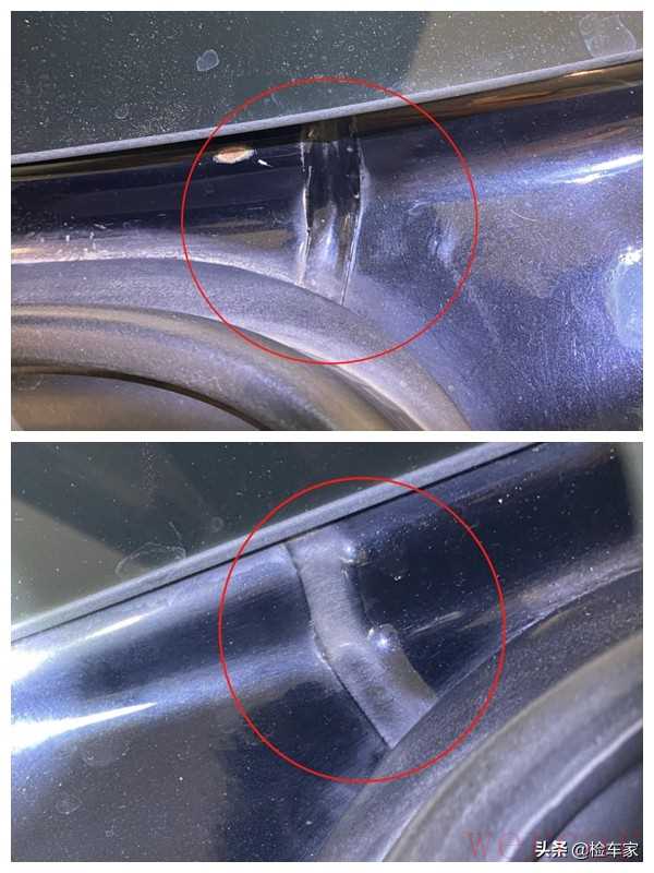 以免检测失误,我还把胶条扒得大一些,从内侧再检查一遍。那么答案已经近在眼前,明显能看到砂轮机打磨烧焊点的切割焊接痕迹,看来之前检测到右后叶子板漆面偏低时,我的推断还是正确的,只是靠着对“官方二手车”的迷之信任,没有马上下结论。