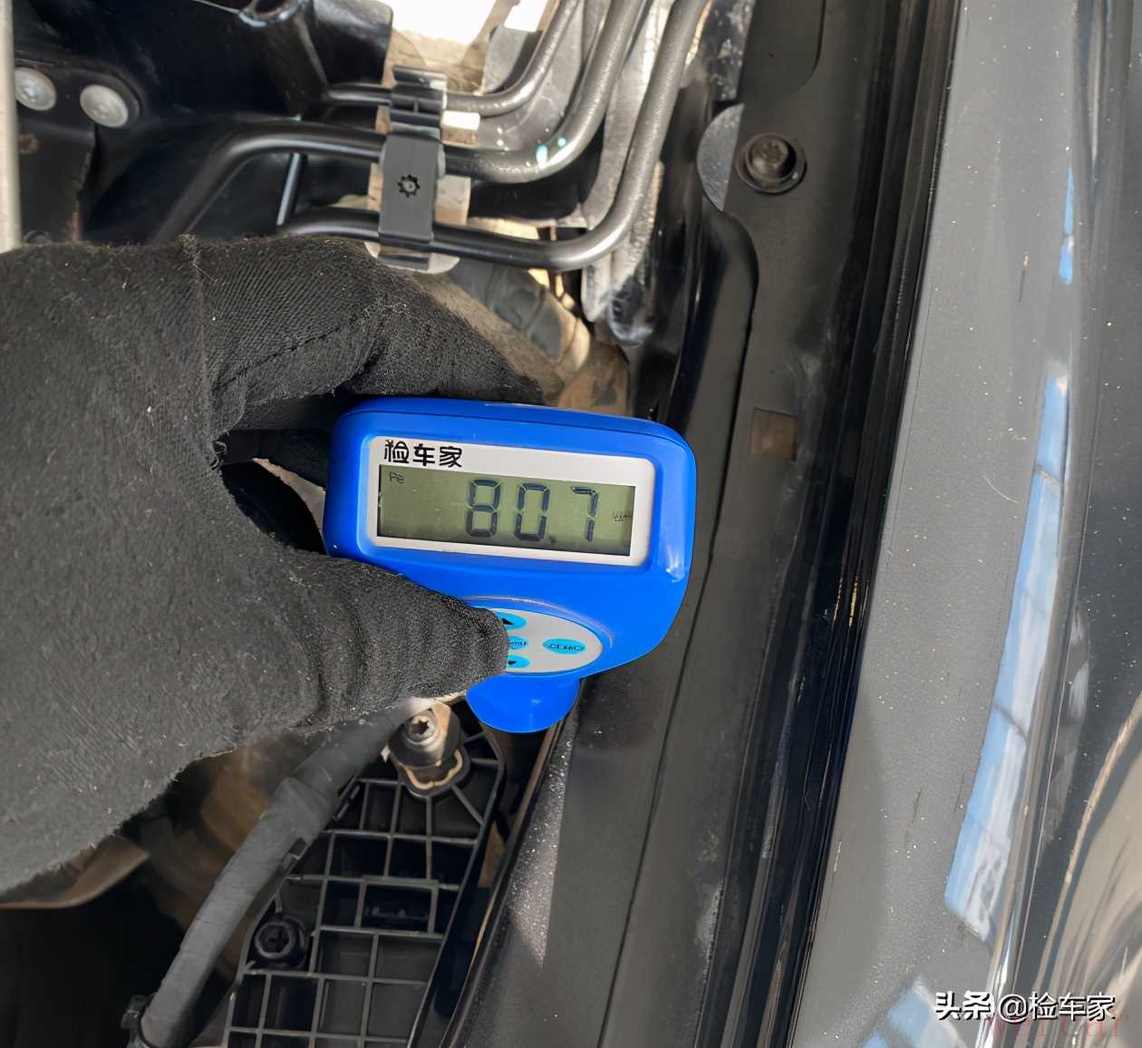 按照顺序,从机舱结构件开始检测,发现叶子板固定螺丝有拆卸,不过漆面数值倒是没有发现异常。但我们在检测外观时发现叶子板只是喷漆并未做钣金,那么为什么要拆卸呢?难道前面的叶子板也存在更换?先记下来一会再做确定,不过对于这些覆盖件来说,即便换了也没什么影响,只是价格又要砍一砍了。