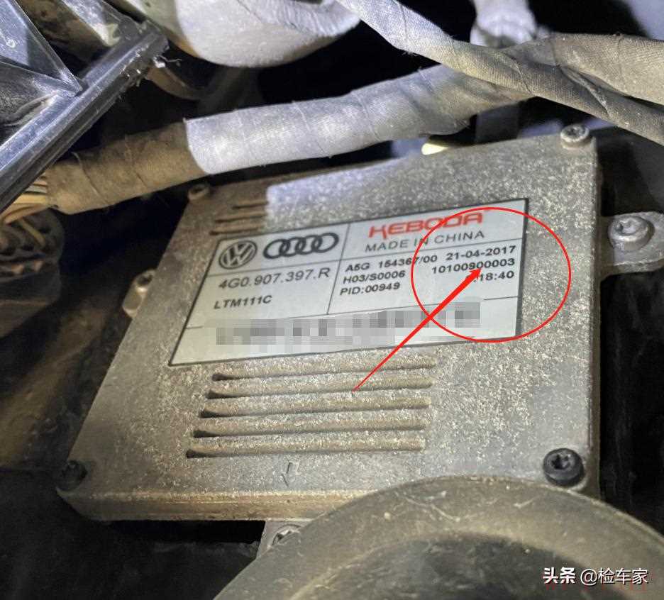 随后发现左前大灯的出产日期为2017年4月份,明显是后期换的,这下离更换叶子板的推断又近了一步。可能是左前方有个小碰撞,但不排除叶子板进行了间隙调整,至于碰撞的程度有多大目前还不明确,得对右前方的部位加大工作力度重点排查。