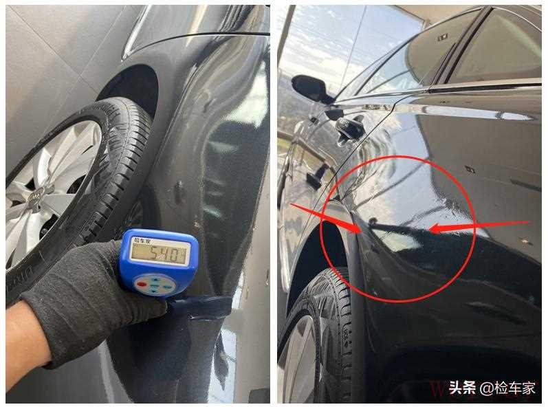接着检测到右后叶子板时,发现漆面数值反而偏低了接近一倍,一般这种情况都是更换叶子板,无论什么车型漆面数值低于整车漆面太多的话那么基本上都是有更换。这可是4S店的官方认证诶,虽然漆面数值这么低,但我检测到这里的时候完全不认为叶子板有切割更换,不过后面的检测也是啪啪打脸!